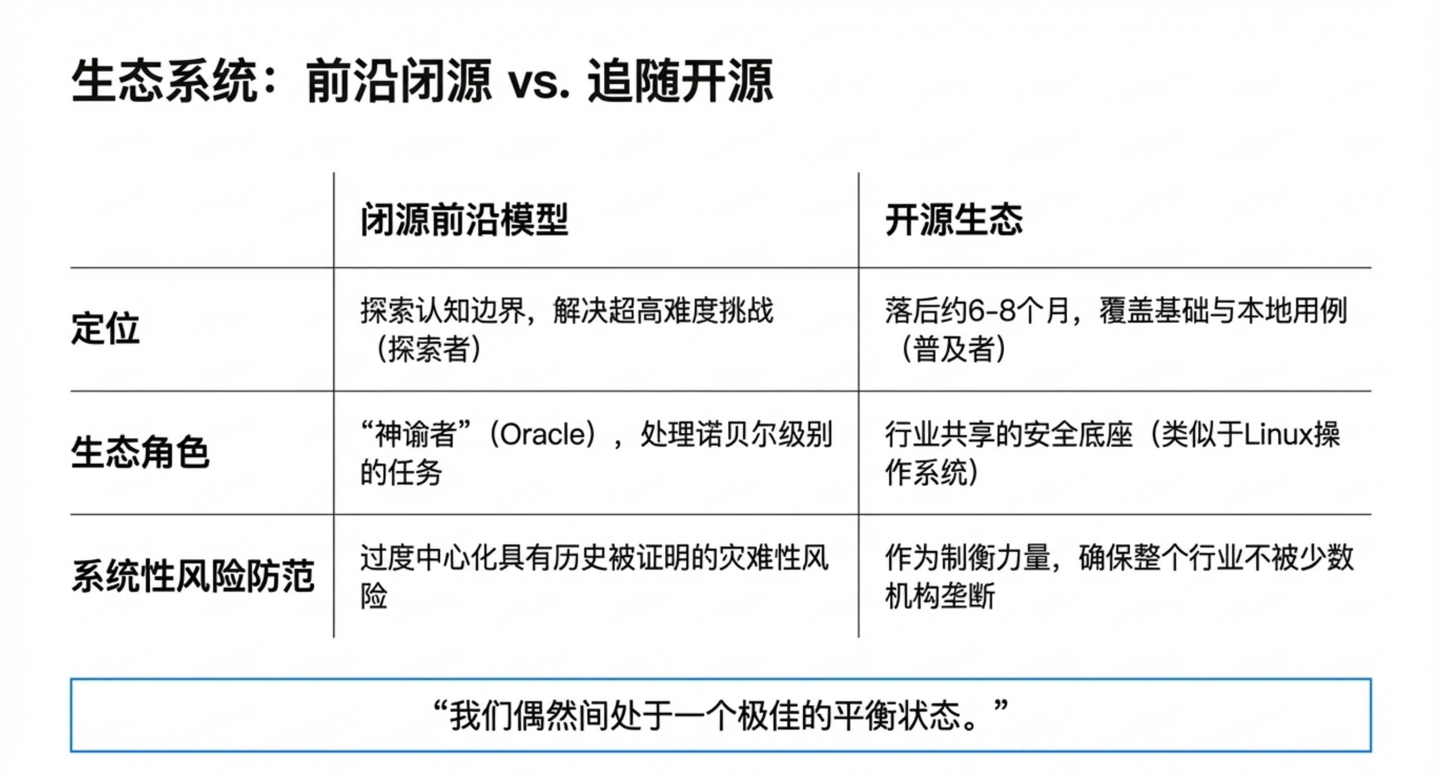 在产业结构上,他强调,当前闭源模型与开源模型之间正在形成一种“动态平衡”——前者探索能力边界,后者实现能力民主化,开源落后 6 个月,反而是 AI 世界最健康的状态。