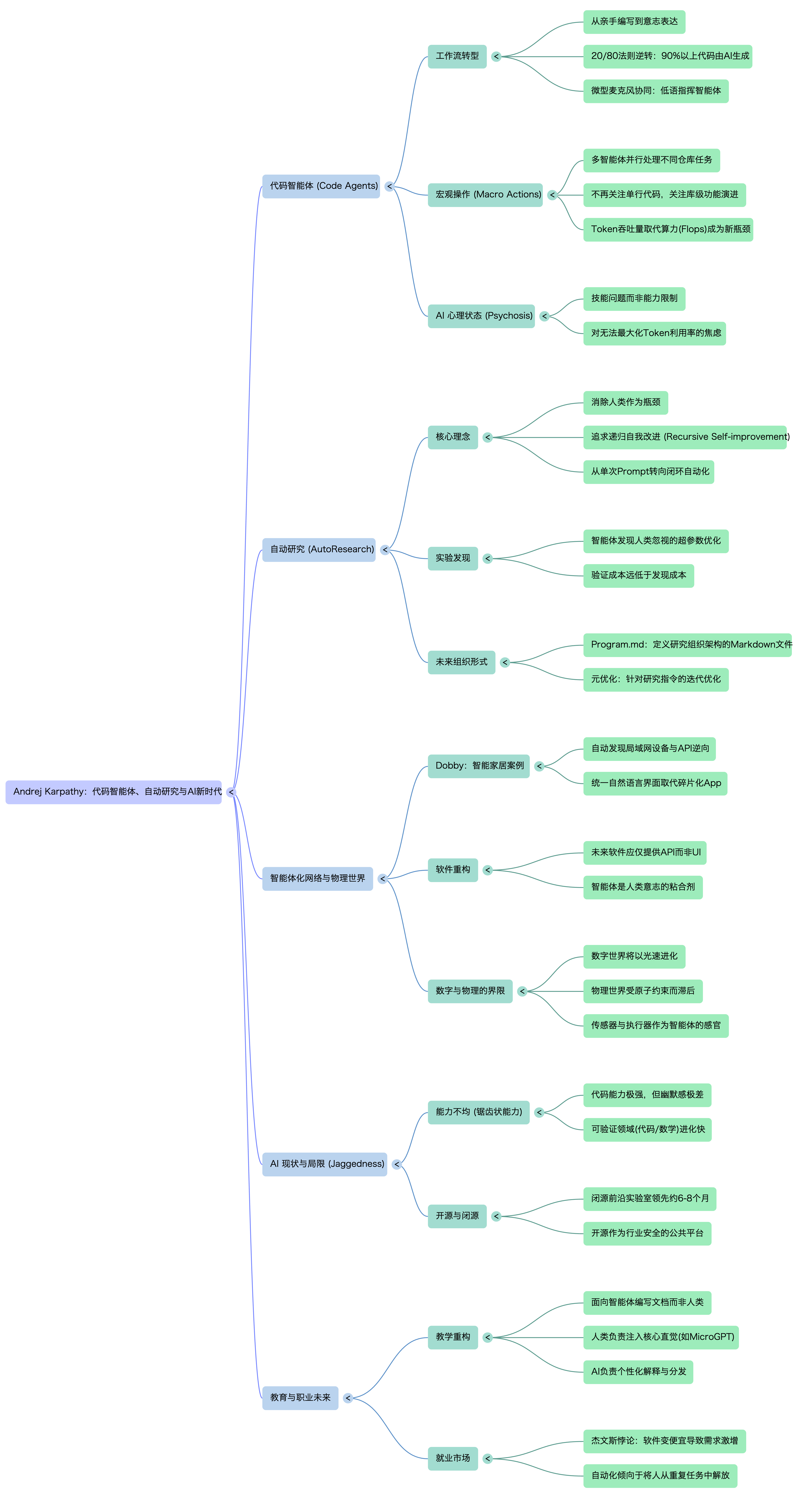 - 编程终结:Karpathy 描述自己进入了一种“AI 精神错乱”状态——不再亲自写代码,而是全天候向智能体表达意图。他的工作变成指派一个智能体研究需求、另一个写代码、第三个制定计划,像指挥交响乐一样操纵整个代码仓库。
