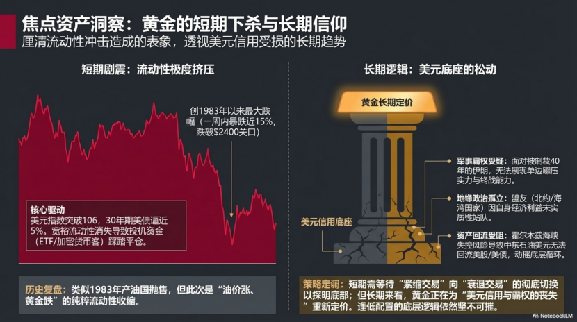 黄金也未能幸免,在美元流动性骤然收紧的冲击下,金价一周内暴跌约15%,创下四十年来最大单周跌幅。黄金的短期定价被紧缩交易主导,但其长期逻辑,即战争对美国军事霸权与美元信用的潜在侵蚀却可能因此被进一步强化。