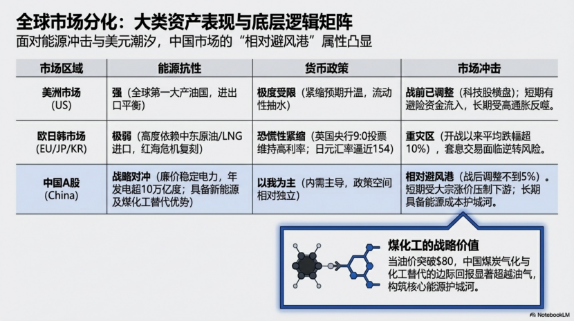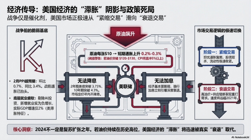 这场战争并未创造新的趋势,而是猛烈加速了战前既有的轨迹——将本已处于“类滞胀”边缘的美国经济更快地推向衰退交易,同时也在考验中国凭借“煤电+新能源”的能源自主性所能获得的相对优势。