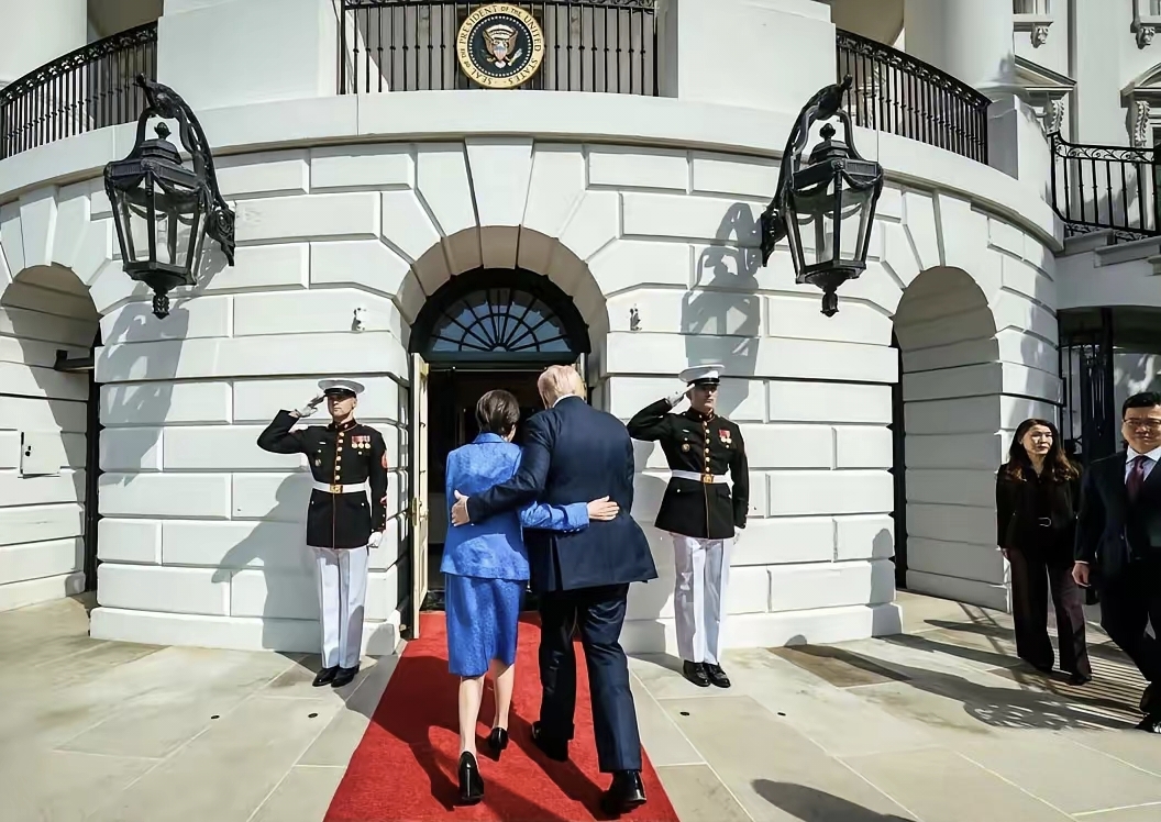说白了,这张照片就是一面镜子。它照出了日美同盟的本质:日本在安全和经济上离不开美国,只能用放低姿态、甚至丢掉尊严的方式,去换一点所谓的“支持”,就像车力巨人永远依附于兽之巨人一样。而摄影师用开放式构图,把这份卑微和失态放大到了极致,此时站在画外享受追捧的人,已经不单单是特朗普一个人,而是美国以及从前往后历代的一个个总统,他们因为这张照片的定格,都将拥有这份居高临下的尊崇。白宫的快门,就是把这份小丑般荒诞的卑微,永久的钉在历史的柱子上。