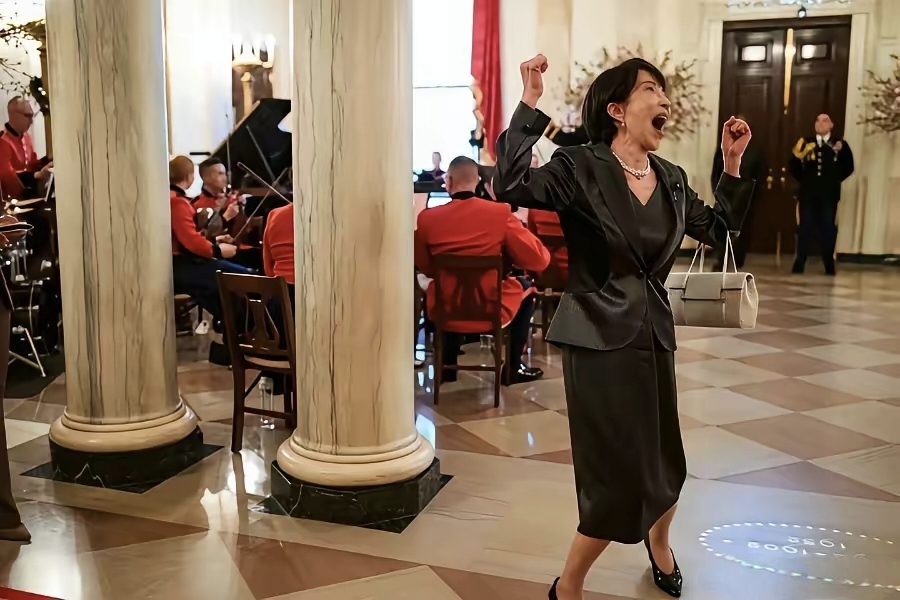 我是瞳叔,一个你摄影路上的同行者,咱们先说说这张照片是怎么来的。2026年3月,高市早苗第一次以首相身份访美,在白宫的宴会厅里,官方摄影师精准按下了快门,还主动把这张图发到了官网和社交平台。你看她,穿着精致的黑套装,拎着小手包,本该是端庄的外交场合,却像个情窦初开的老少女一样,蹦跳欢呼,这卡哇伊,这姿态,几近谄媚,妖娆勾魂。