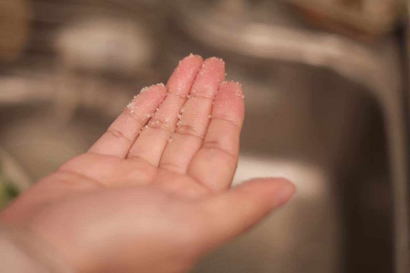 美娟做菜烫到手。先用冷水冲,然后把白糖撒在烫的手指上,让糖吸收热能。