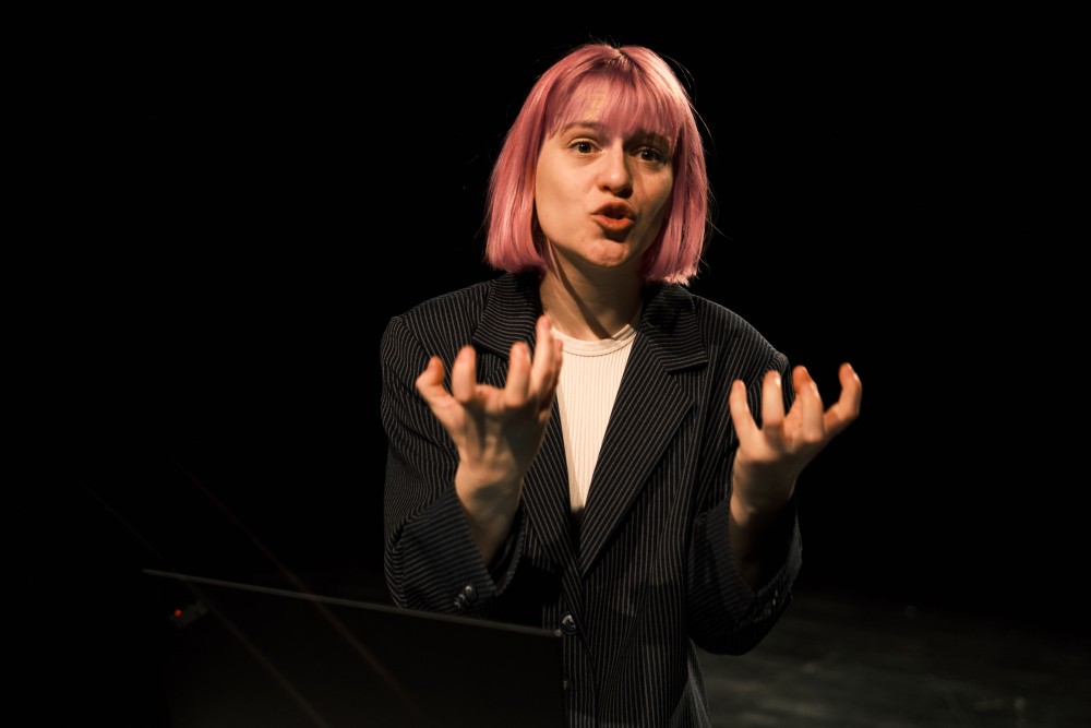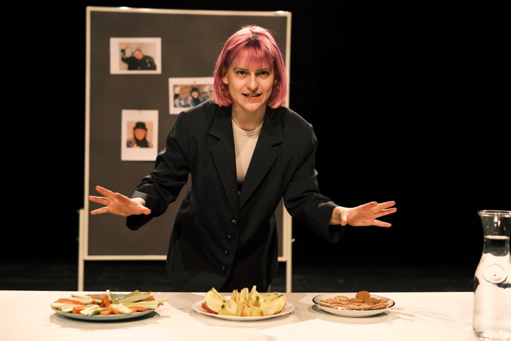这场 lecture performance(讲座式表演)以表演者本人作为导演见习(Regiehospitantin)的经历为出发点,探讨了剧场中权力与等级结构的运作方式。通过日记记录和语音信息,表演者回忆起自己在柏林剧团(Berliner Ensemble)的那段时间。这段个人经历指向了更大的问题,一个系统性的问题:为什么在剧院运作中,一些带有权威主义色彩的工作方式和权力动态似乎被完全视为理所当然?为什么在这个国家的舞台上不断讨论解放(emancipation)与多元主义(pluralism)等议题,而在实际的制作过程中却往往呈现出截然不同的现实?