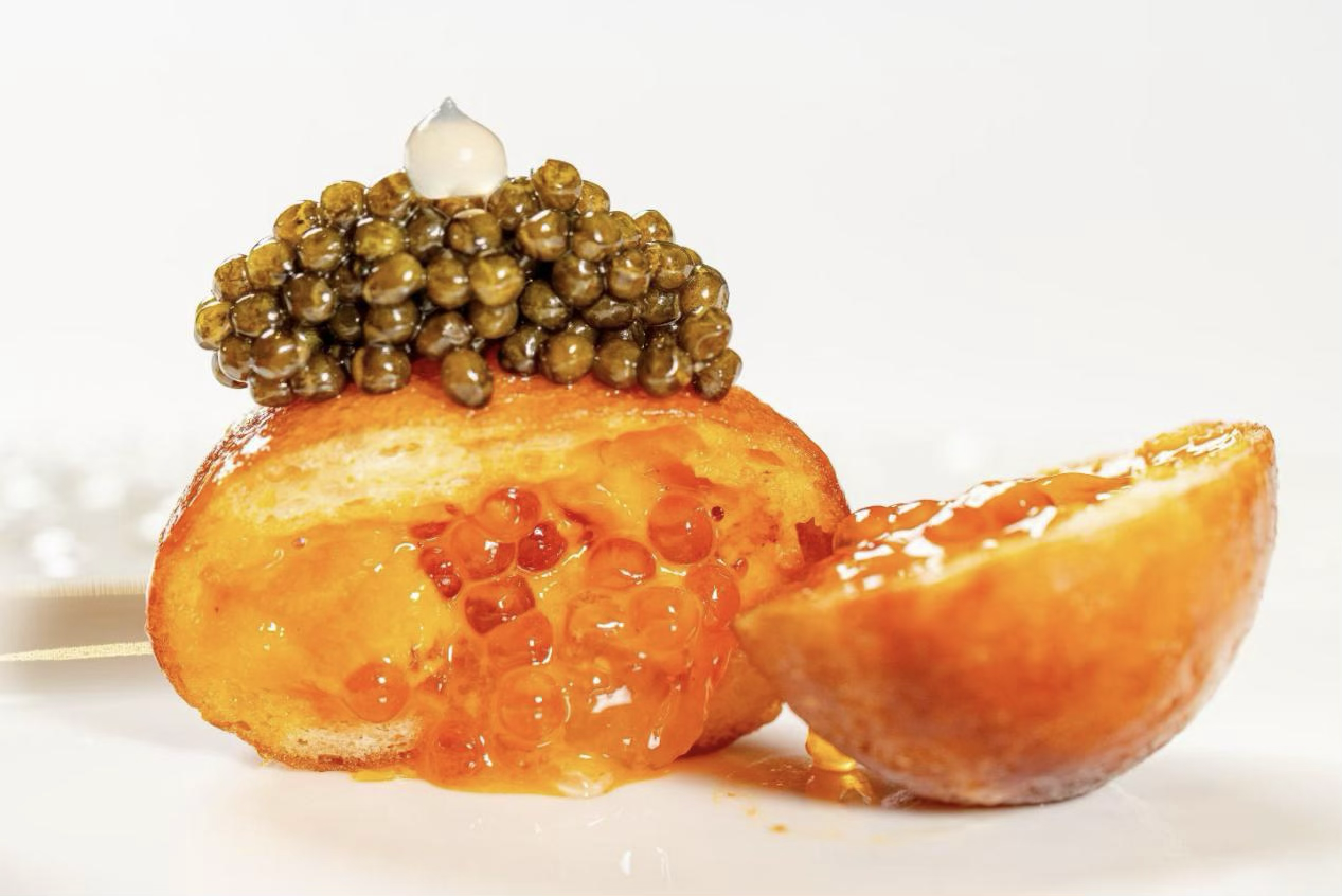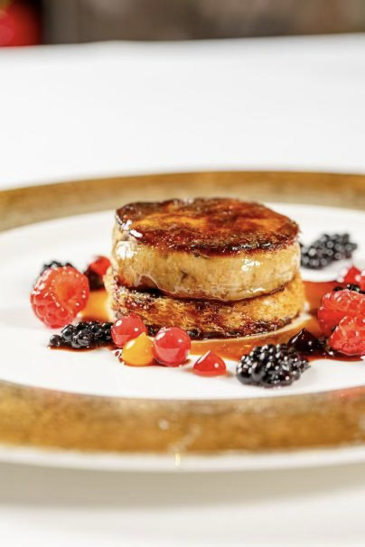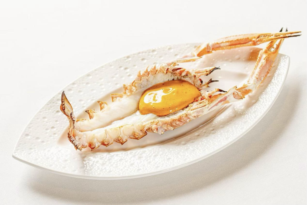 品尝充入空气酱汁的炭烤大鳌虾与脆壳焦糖鹅肝 。