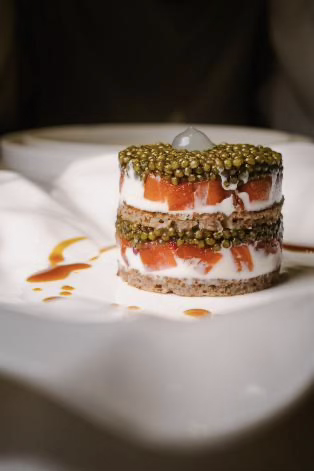 Pocky老师口中像吃汉堡的,烟熏三文鱼鱼子酱“蛋糕”