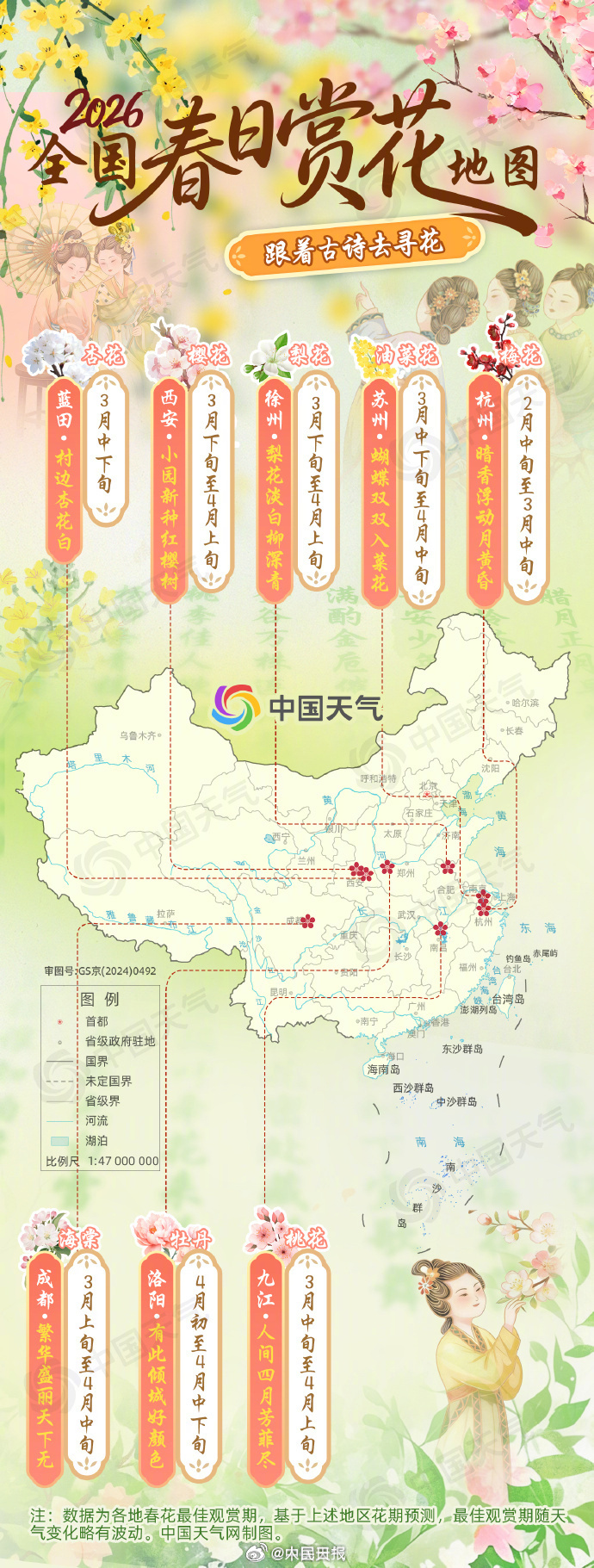 树木发芽生长,柳絮杨絮漫天,花朵相继绽放(下方附上了全国寻春地图和济南公园赏花指南,供大家参考)。