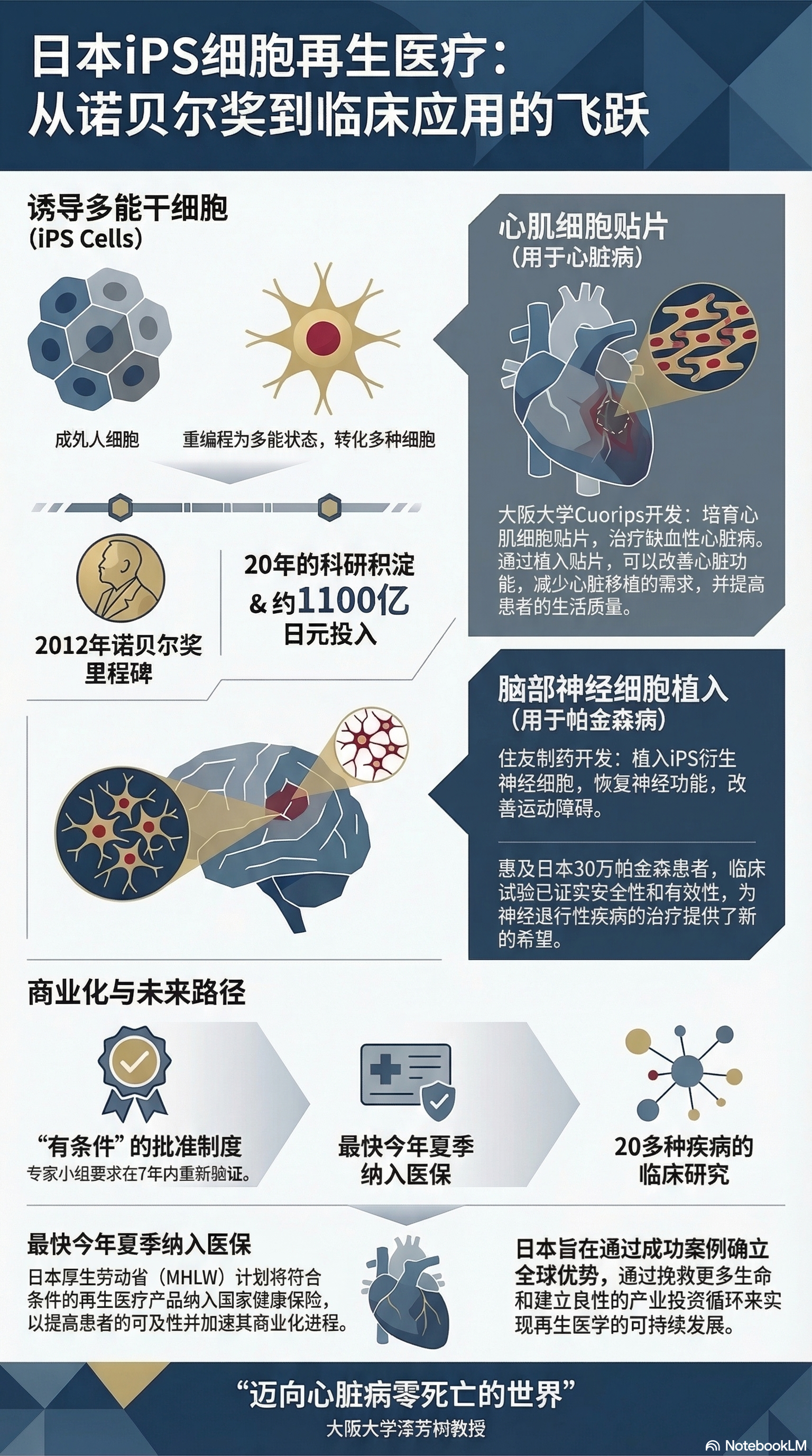 日本厚生劳动省近期预计将批准全球首批基于诱导多能干细胞(iPS细胞)的商业化医疗产品。这项突破性的决定涵盖了两项创新疗法:一种是用于修复受损心脏的心肌细胞贴片,另一种则是旨在改善帕金森病患者运动功能的脑部植入技术。自山中伸弥教授因发现iPS细胞获得诺贝尔奖以来,日本政府已投入巨资推动该领域从基础研究向临床应用转型。如果最终获得通过,这些产品最早可能在今年夏天纳入公共医疗保险体系,为数以万计的重病患者带来康复希望。这一进展标志着再生医学正走出实验室,正式开启其在全球医疗市场的大规模实践阶段。