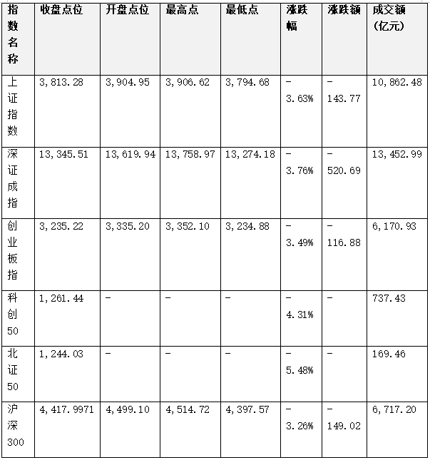 • 指数全线重挫: 沪指跌破3900点,盘中最低触及3794.68点,险守3800点;深成指、创业板指跌幅均超3.4%