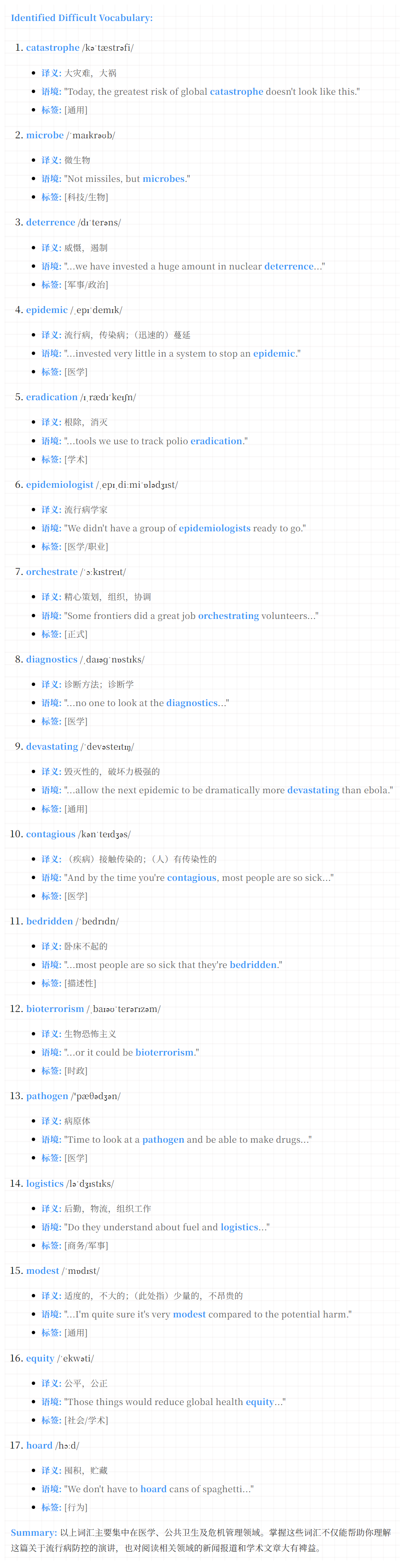 演讲时长约8分钟,盖茨基于2014年埃博拉疫情的教训,警告全球对下一场传染病大流行的准备严重不足。他指出:战争或恐怖主义常被视为最大威胁,但真正可能杀死数千万人的是高度传染性病毒(如流感)。他用模拟演示说明,如果一种类似1918年西班牙流感的病毒在今天爆发,可能造成数千万死亡和巨大经济损失。盖茨批评世界在疫苗研发、医疗响应系统、卫生工作者培训和疫情模拟演练上的投资太少,呼吁立即行动:“不需要恐慌,但必须开始行动。”他强调预防性投资能拯救生命和经济。