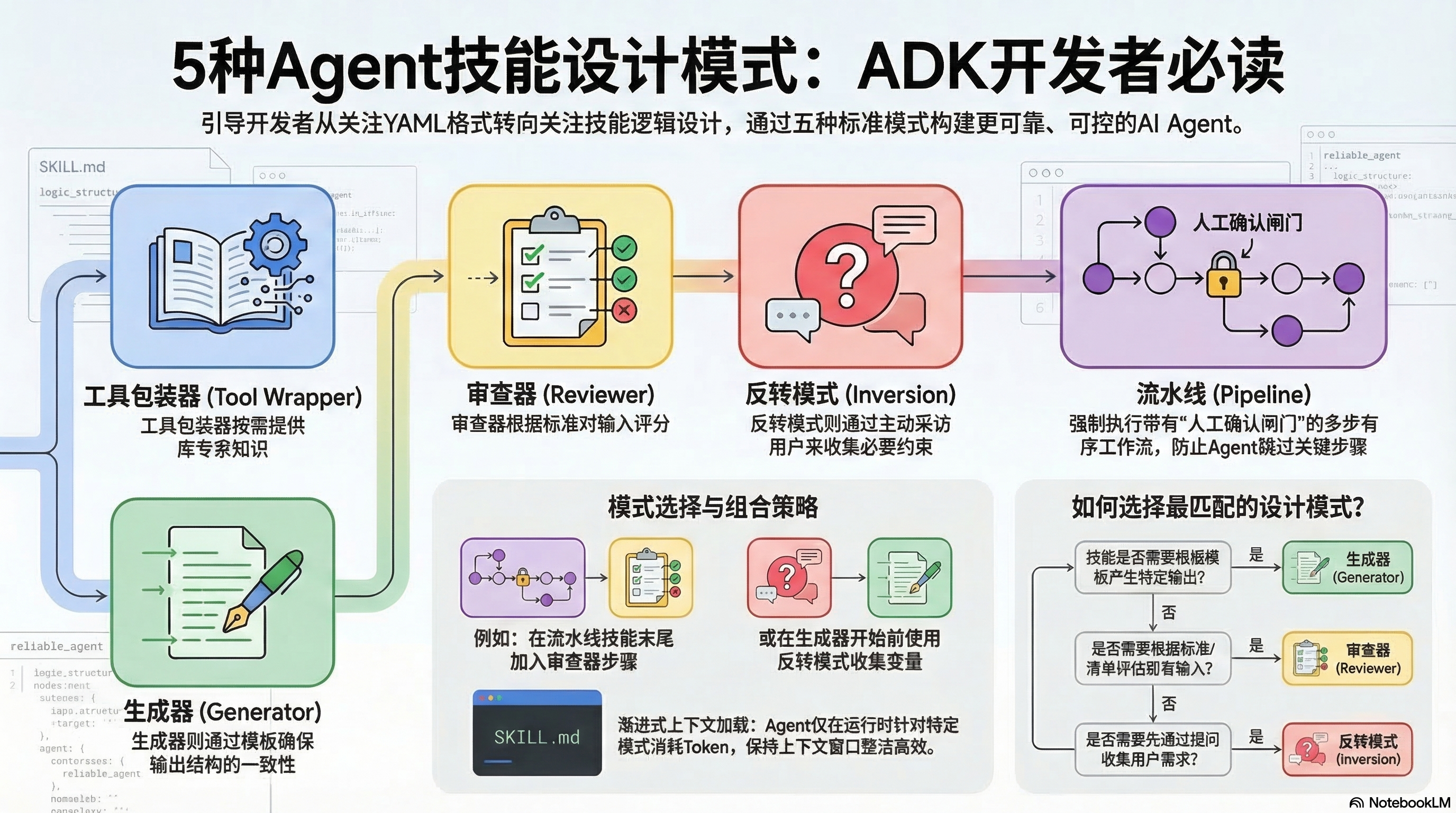 这篇文章介绍了谷歌代理开发工具包 (ADK) 的五种核心设计模式,旨在帮助开发者超越基础的格式设定,转而优化智能体内部的逻辑架构。工具封装器 (Tool Wrapper) 能够为智能体提供特定库的专业知识,而生成器 (Generator) 则通过模板确保输出结构的高度一致。审核器 (Reviewer) 模式通过独立的评估准则实现代码审查的自动化,反转 (Inversion) 模式则让智能体通过主动提问来精准收集需求。最后,流水线 (Pipeline) 模式通过严格的步骤和准则强制执行多环节的工作流。这些模式可以灵活组合,使开发者能够构建出比传统单一提示词更高效、更可靠且具备上下文感知能力的智能体系统。