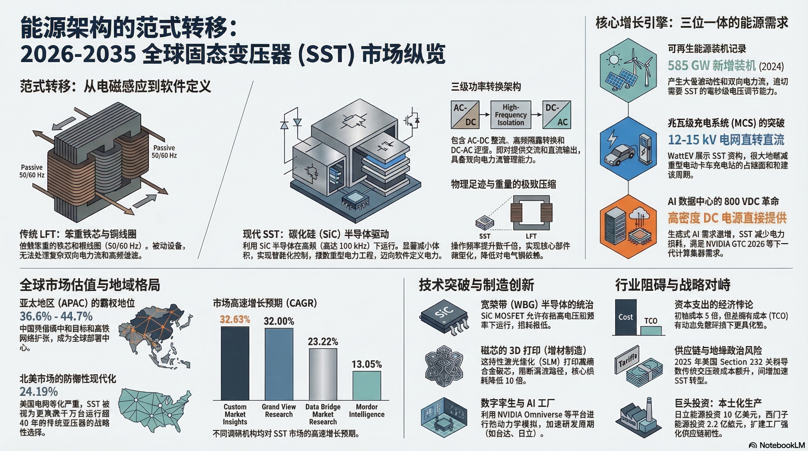 提供的资料详细分析了固态变压器 (SST) 市场的演变,指出该技术正推动电力基础设施从传统的被动感应向智能化、软件定义型节点转型。受可再生能源并网、电动汽车重型充电及AI数据中心爆发式电力需求的驱动,SST 凭借其在电压调节、双向功率流和体积微型化方面的显著优势,正逐渐取代传统的铁芯变压器。尽管面临高昂的初始成本和电网保护协议等技术挑战,但宽禁带半导体 (SiC) 的突破与增材制造技术的成熟正不断降低生产门槛。在全球范围内,亚太地区凭借政策支持占据市场主导地位,而北美和欧洲则将其视为应对供应链脆弱性和实现碳中和目标的战略重点。以 Hitachi Energy、西门子和 Schneider Electric 为代表的行业巨头正通过大规模本土化投资和数字化平台开发,竞逐这一极具增长潜力的清洁能源技术