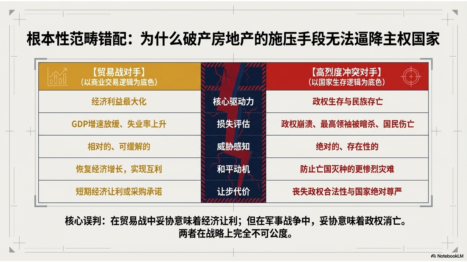 11:29 损失可逆性与政权存亡的误判:指出贸易战损失可逆,而军事战争关乎国家存亡与不可逆的毁灭,特朗普彻底误判了伊朗的生存底线