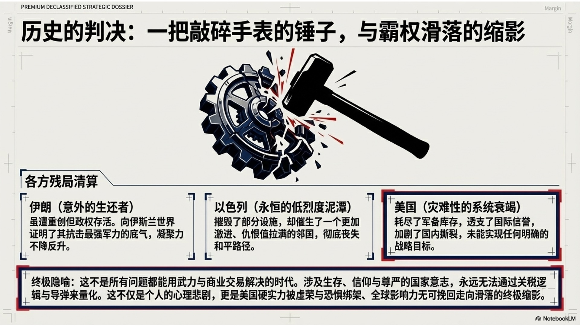 37:30 帝国的衰退与三国的长远结局:总结这场受个人心理弱点驱动的战争未能达成目标,反而让伊朗更稳固,并加速了美国全球信誉与影响力的衰落。