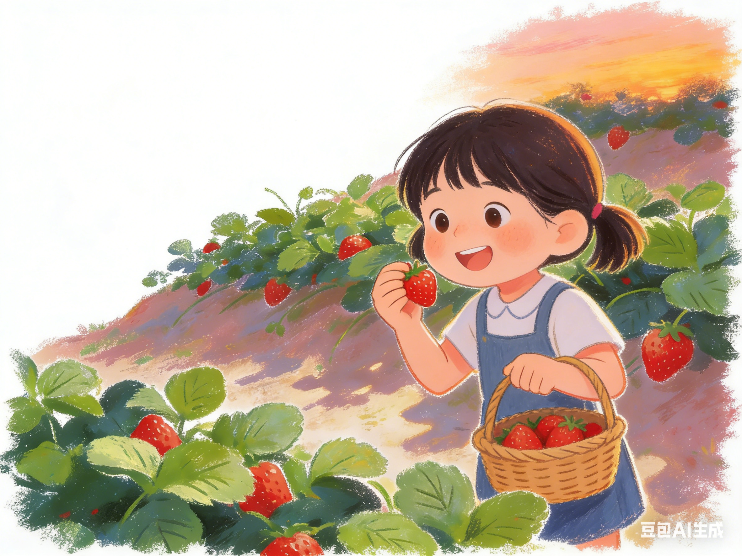 一个小女孩,提着一只小篮子,蹲在草莓地边上。她轻轻地拨开叶子,一颗一颗地看。她看到了这颗草莓。