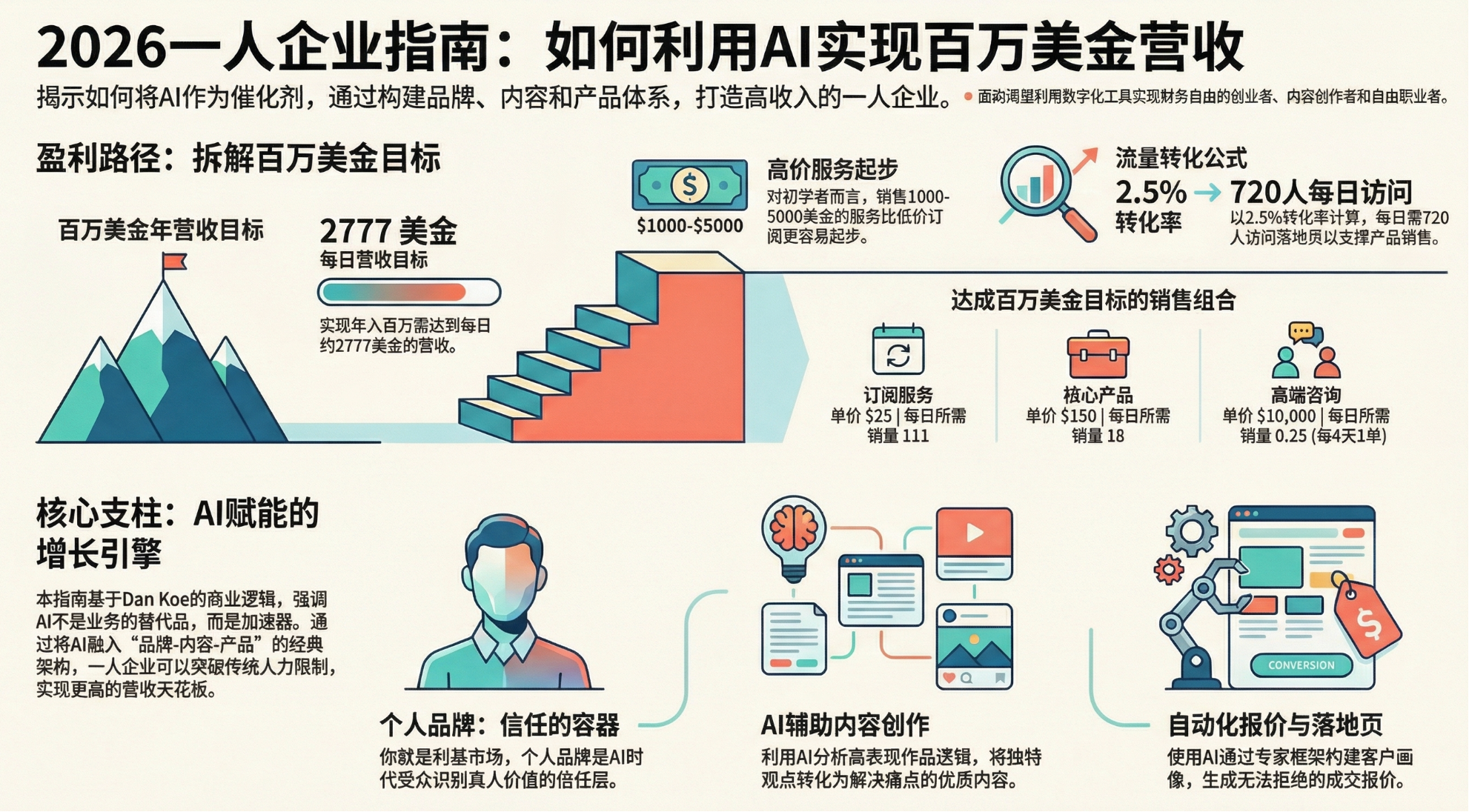 * 07:31 百万美元收入的路径拆解:Dan Koe将年入百万美元的目标拆解为日入2777美元,并提出了多种实现路径。他强烈建议新手从客户服务路线开始,因为“把一个一千到五千美元的服务卖给一个人,要比把一百到两百份Substack订阅卖给一百到两百个人……容易得多”。