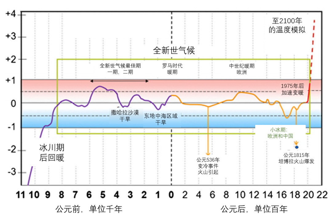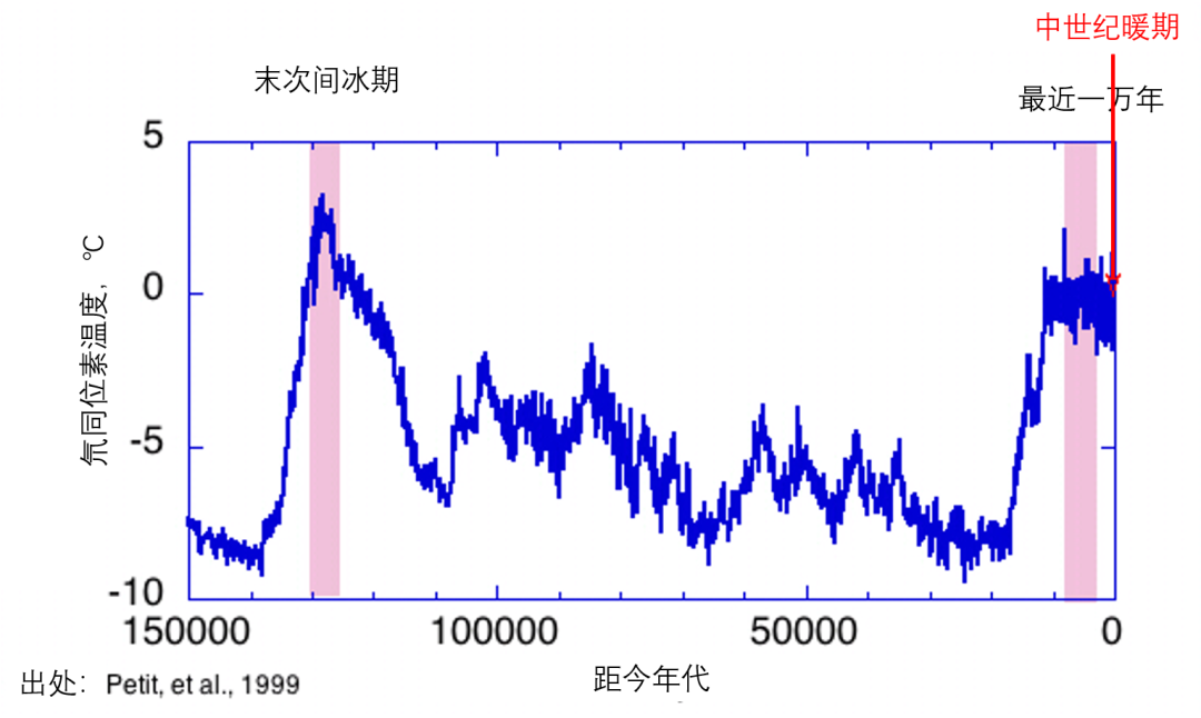 最近15万年和最近1.1万年的气温变化 | 在15万年的尺度上,当代是一个快速升温之后的稳定高位期;在1.1万年的尺度上,当代处于总体稳定、缓慢降温(不考虑当代全球变暖)状态下。