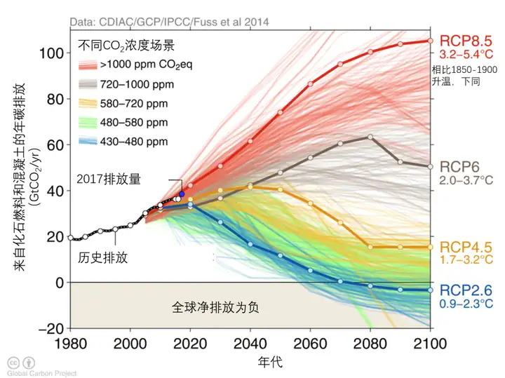 图注:RCP路径是根据不同碳排放量模拟的未来升温场景,大力减排实现负排放的RCP2.6路径是最理想的预期,本世纪末的全球升温不超过2.3℃;而无所作为的RCP8.5路径是最糟糕的预期,本世纪末的全球平均温度或升高3.2-5.4℃。水泥在生产和正常使用中,也会产生二氧化碳排放,是化石燃料之外比较重要的碳排放源。