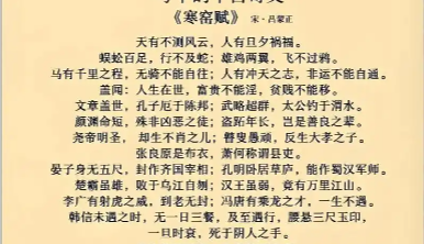 和大家一起赏析《寒窑赋》第一二段。《破窑赋》透出的是人生命运和天地自然变化循环的思想,文章以自己从凄惨到富贵的经历,列举了自古以来历史上诸多名人经历的各种命运和磨难,摆事实讲道理,来说明这世界人生命运的起起落落。