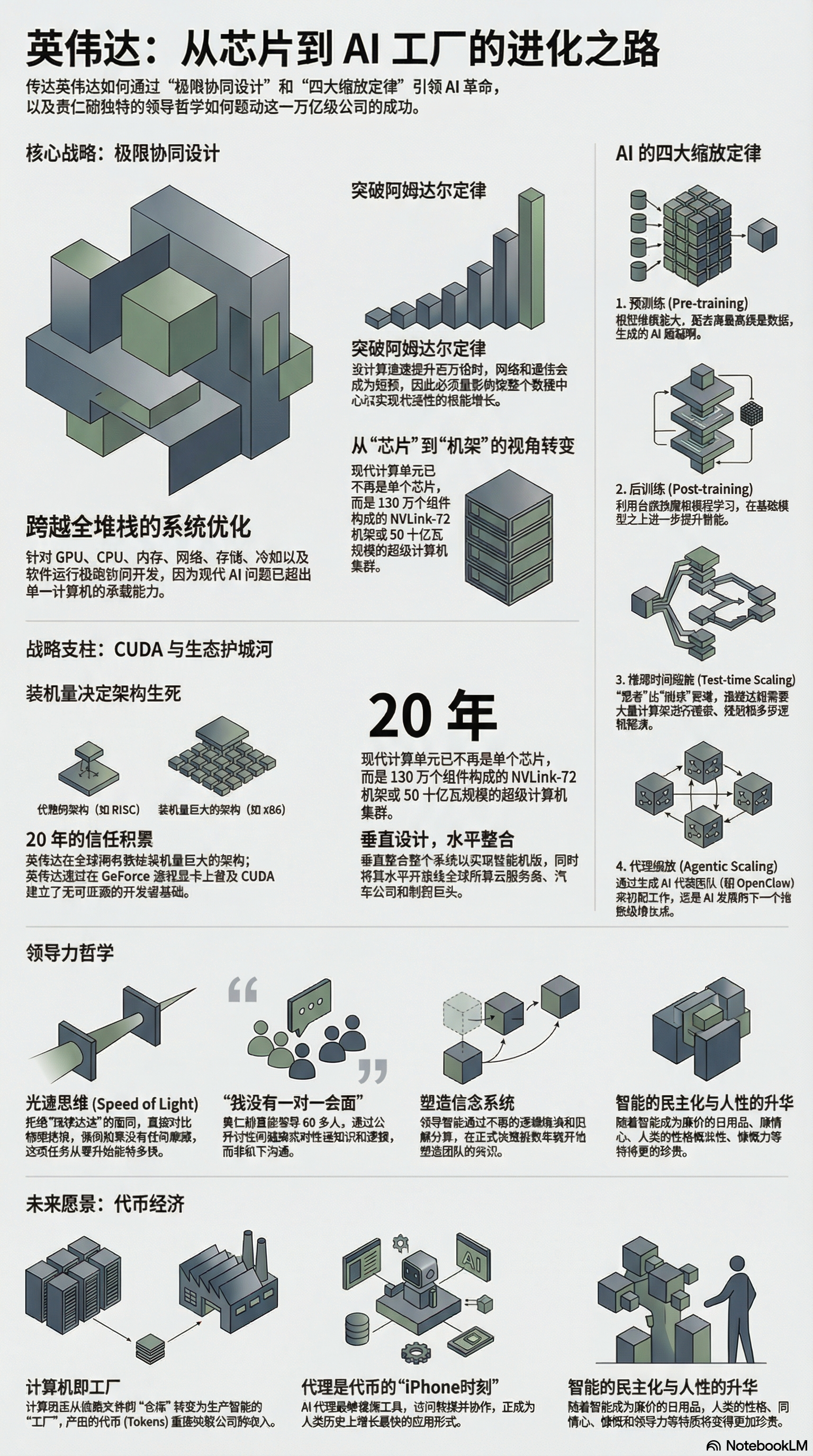 这份文本摘录自 Lex Fridman 对英伟达(NVIDIA)首席执行官黄仁勋的采访,深入探讨了该公司在 AI 革命中的核心角色。黄仁勋解释了英伟达如何从单一的芯片制造转向极端协同设计,通过整合硬件、软件和数据中心架构来超越传统的计算限制。他详细回顾了将 CUDA 引入消费级显卡的豪赌,这一决策虽曾带来财务危机,但最终为现代深度学习奠定了基础。对话还涵盖了 AI 缩放法则的演进,包括合成数据的使用、推理能力的提升以及代理式 AI(Agentic AI)的兴起。此外,黄仁勋分享了其“光速”第一性原理的领导哲学,并讨论了全球供应链、能源效率以及 AI 对未来就业市场的积极重塑。综上所述,这些材料展现了英伟达如何通过前瞻性的工程布局和生态构建,将自身打造为驱动全球智能化的**“AI 工厂”**。