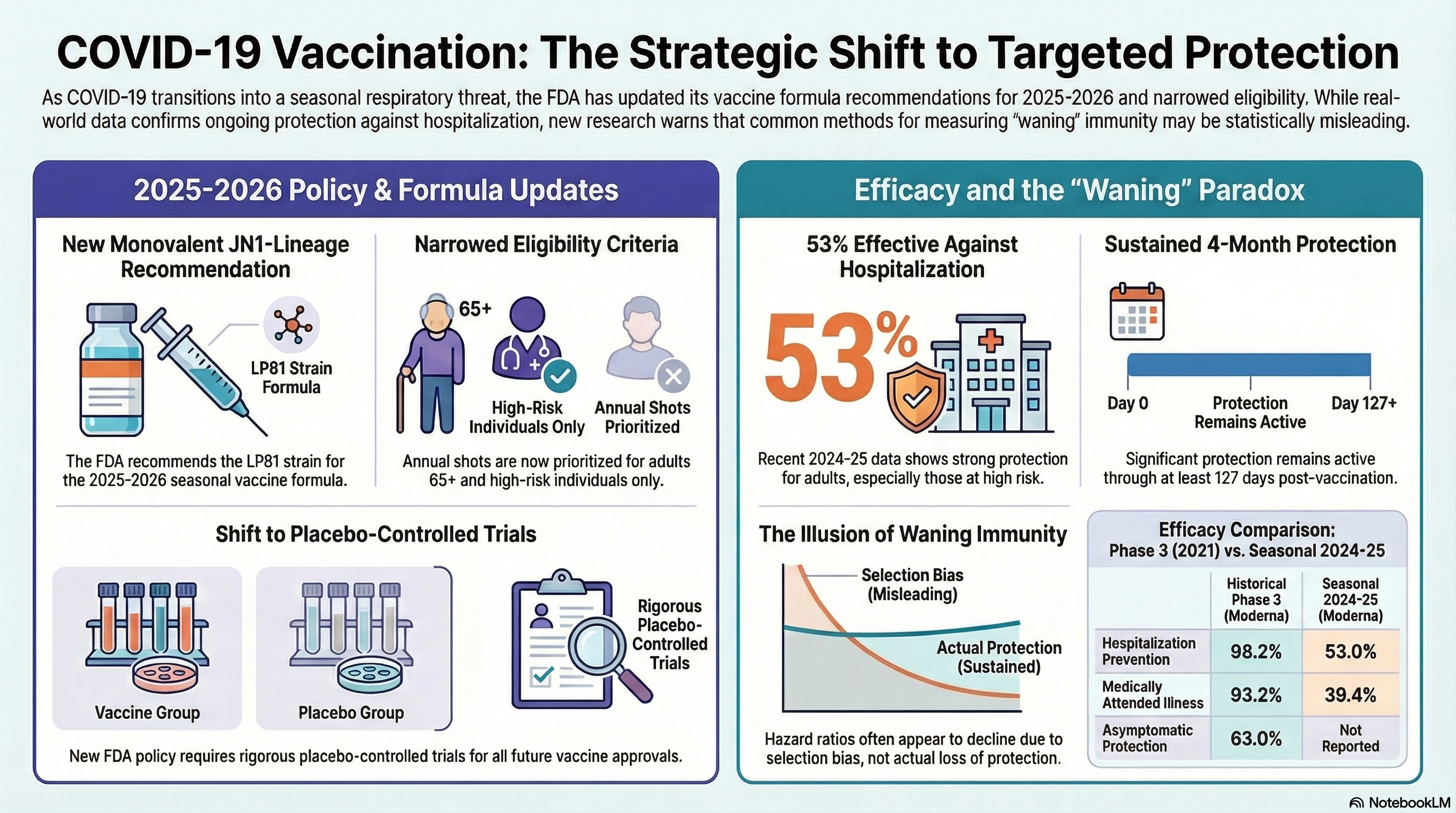 这些资料深入探讨了Mrna新冠疫苗的有效性及其保护力随时间减弱(waning)的复杂现象。研究数据显示,针对 2024-25 流行季,该疫苗对成年人住院治疗的保护效力约为 53%,且在老年人及高危人群中表现出明显的增量保护作用。然而,学术文献指出,利用传统统计模型检测药效减弱存在方法论上的挑战,因为观察到的数据变化可能源于样本选择偏差而非真实的免疫力下降。由于混杂因素和无法观测的个体差异,仅凭生存曲线或风险比往往难以得出关于长期药效的确切结论。因此,专家建议在评估疫苗成本效益时,应考虑最差情景分析,以更准确地应对药效衰减带来的不确定性。