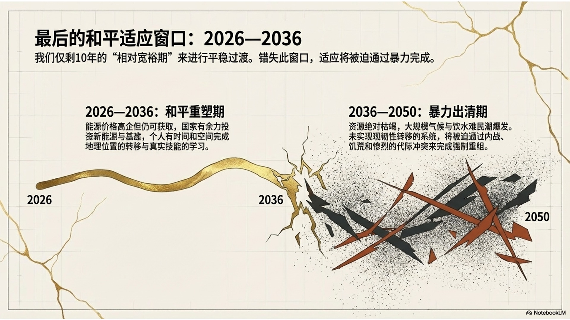 本期节目聚焦2026至2050年人类文明的历史性拐点,深度探讨在全球系统性灾难的冲击下,社会运行逻辑如何从“追求极致效率”被迫全面转向“韧性生存”。