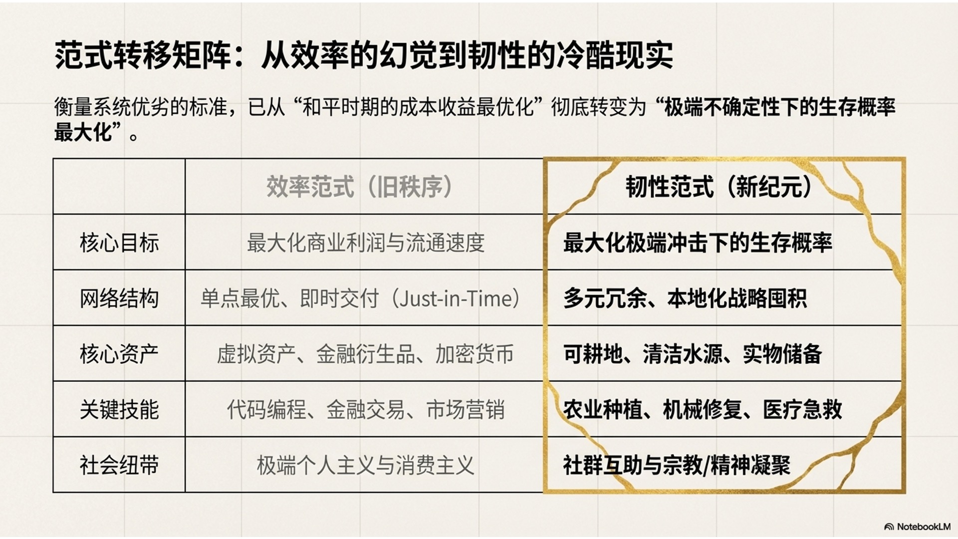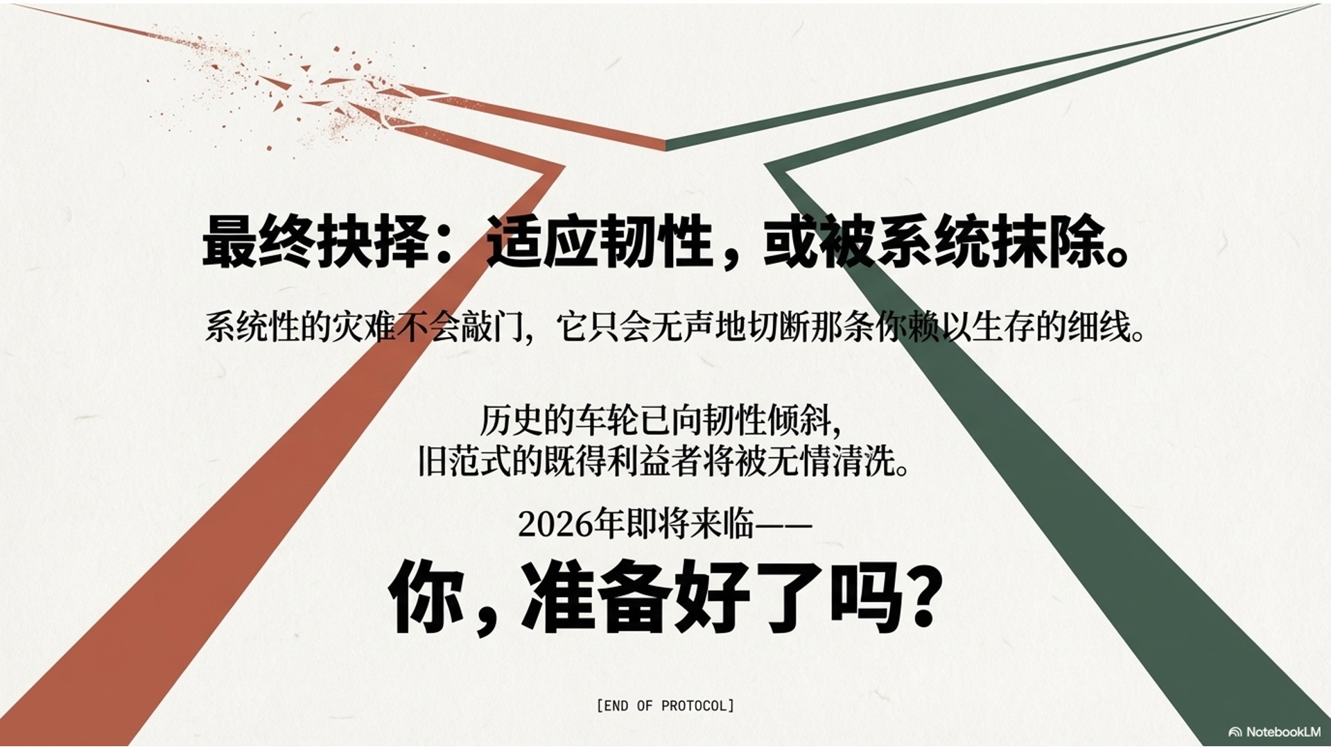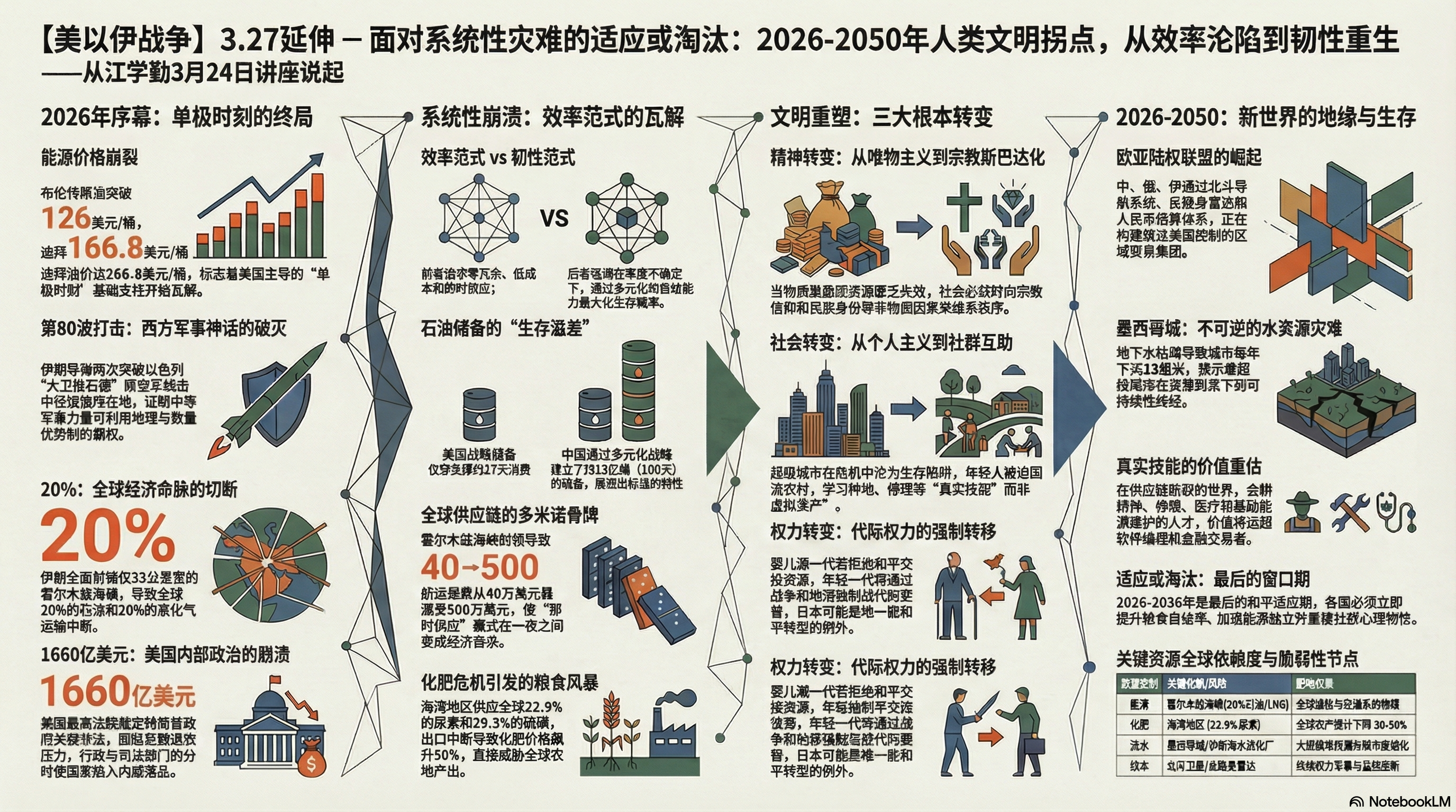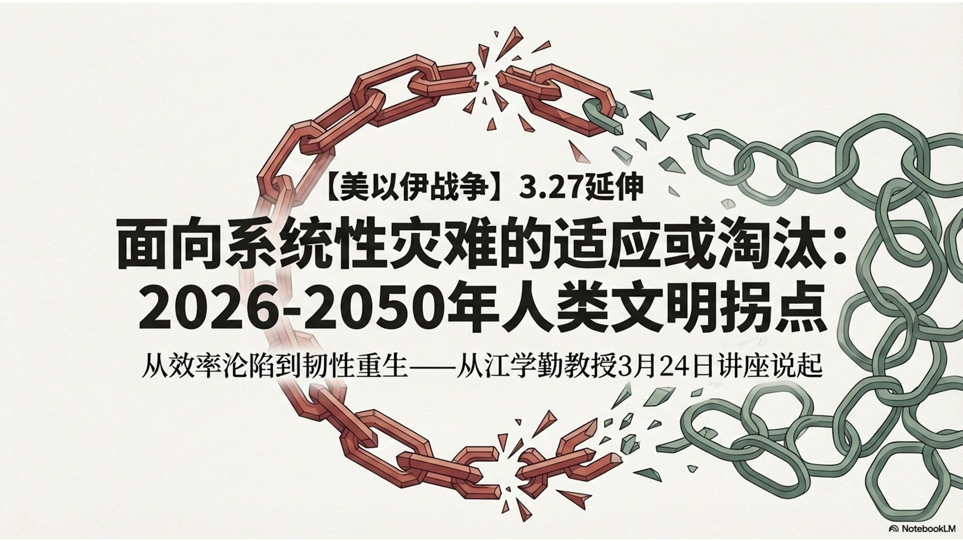 00:07 时代大命题:探讨2026-2050年全球大危机背景下,人类社会从“效率优先”向“韧性生存”的必然转型