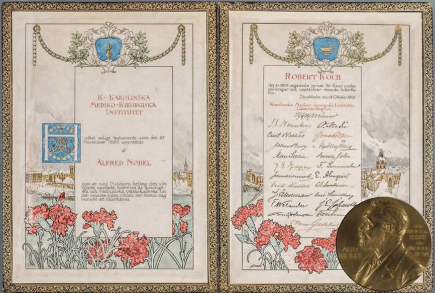 🔺 科赫博士因发现结核病细菌而获得1905年的诺贝尔生理学或医学奖