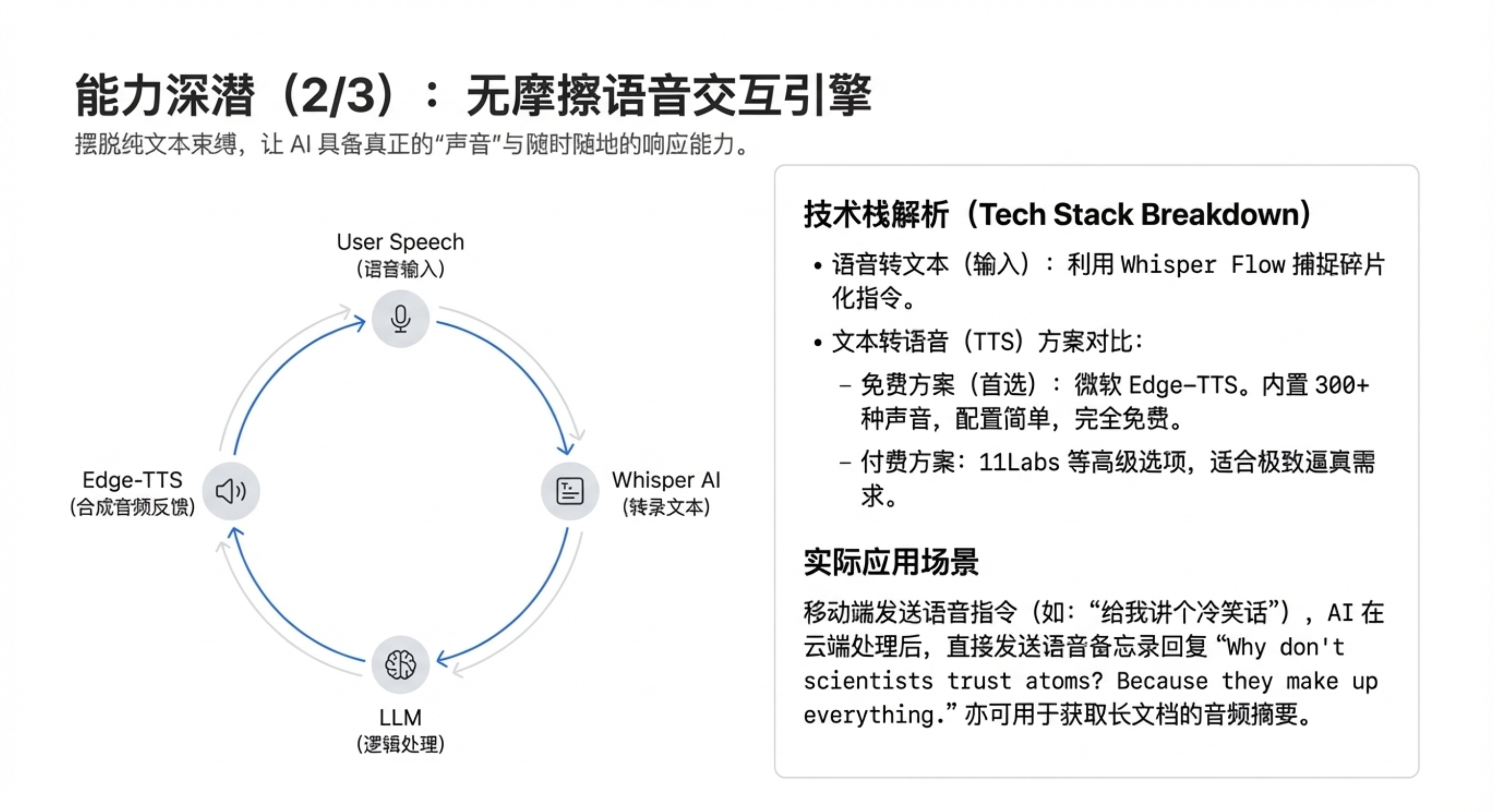 - 语音便条:通过 Edge TTS 或 11 Labs 实现语音转文字,发送语音消息并对话。