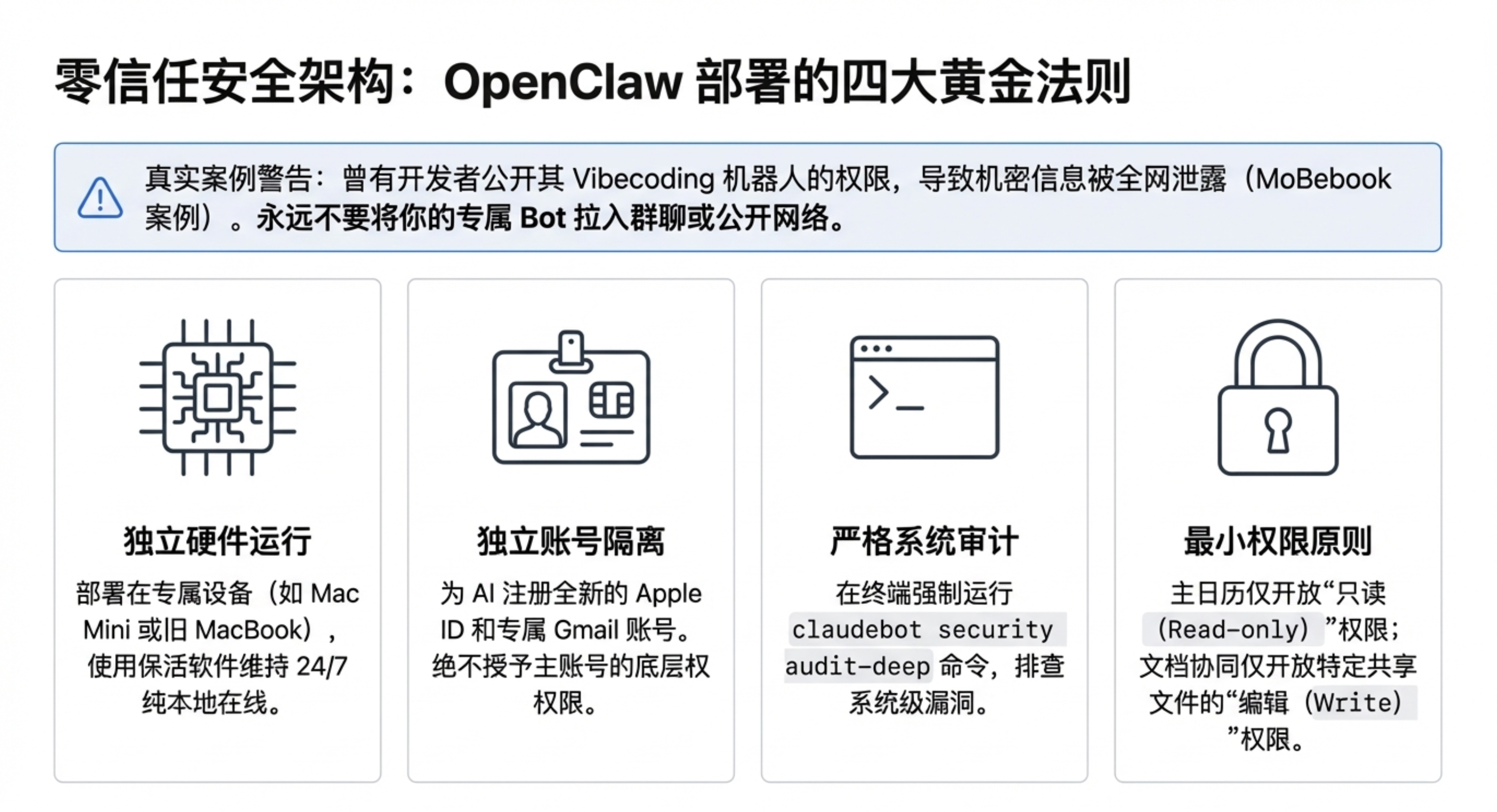 - 专用硬件:用一台24/7运行的旧电脑(如 Mac Mini)作为 OpenClaw 的“物理牢笼”,不混用主力设备。