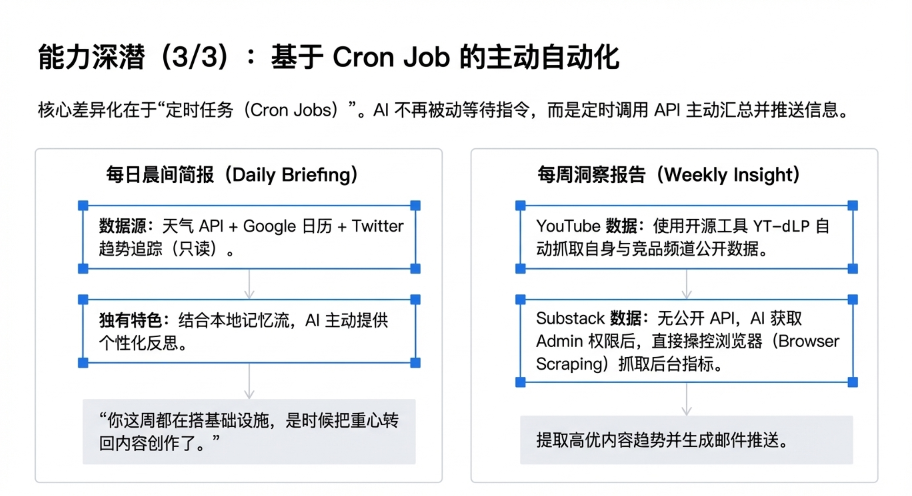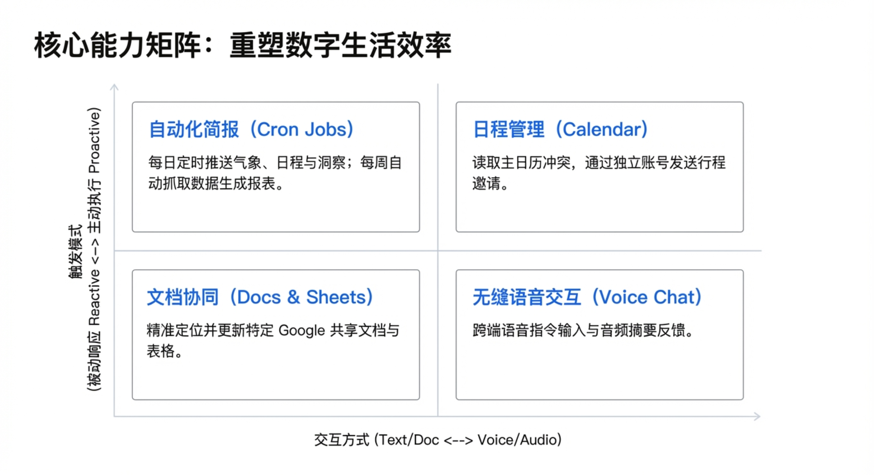 - 每日简报:定时任务整合天气、日历事件、社交媒体趋势,加上基于长期记忆的个性化建议。