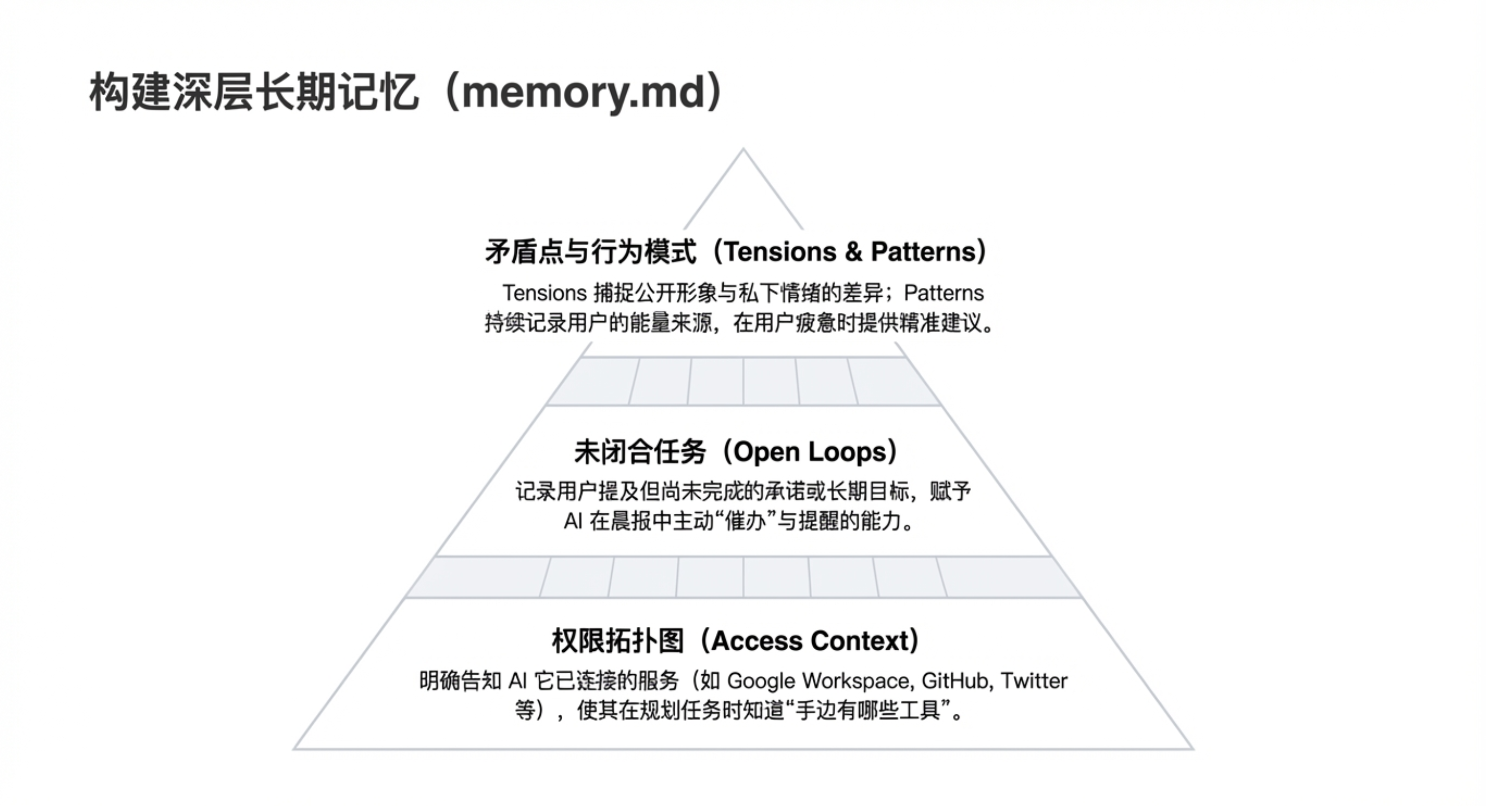 - Memory(记忆):存储长期目标、已连接服务、未完成事项(Open Loops)。