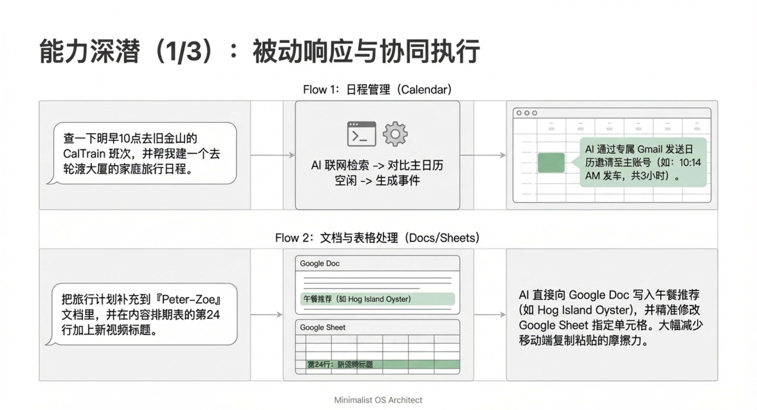 - 文档协作:授权编辑指定 Google Docs/Sheets,自动填充旅行计划或更新内容排期。