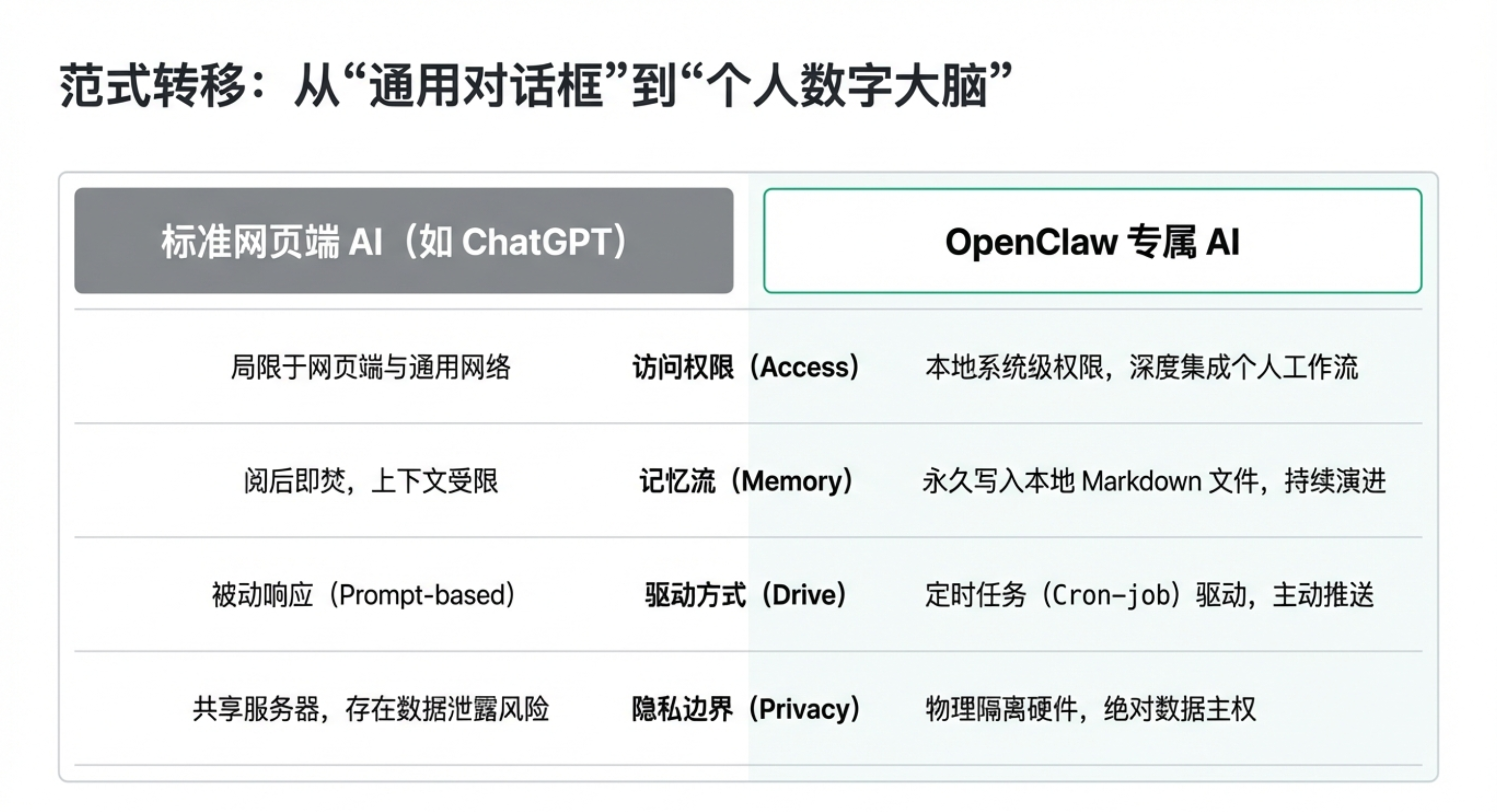 OpenClaw 的独特之处,在于它把控制权完全交还给你。从物理硬件到账号权限,从记忆内容到性格设定,一切都透明、可编辑、可回溯。它不是云端的大众助理,而是你亲手打造的、运行在自家设备上的数字分身——安全、私密,且真正“懂你”。