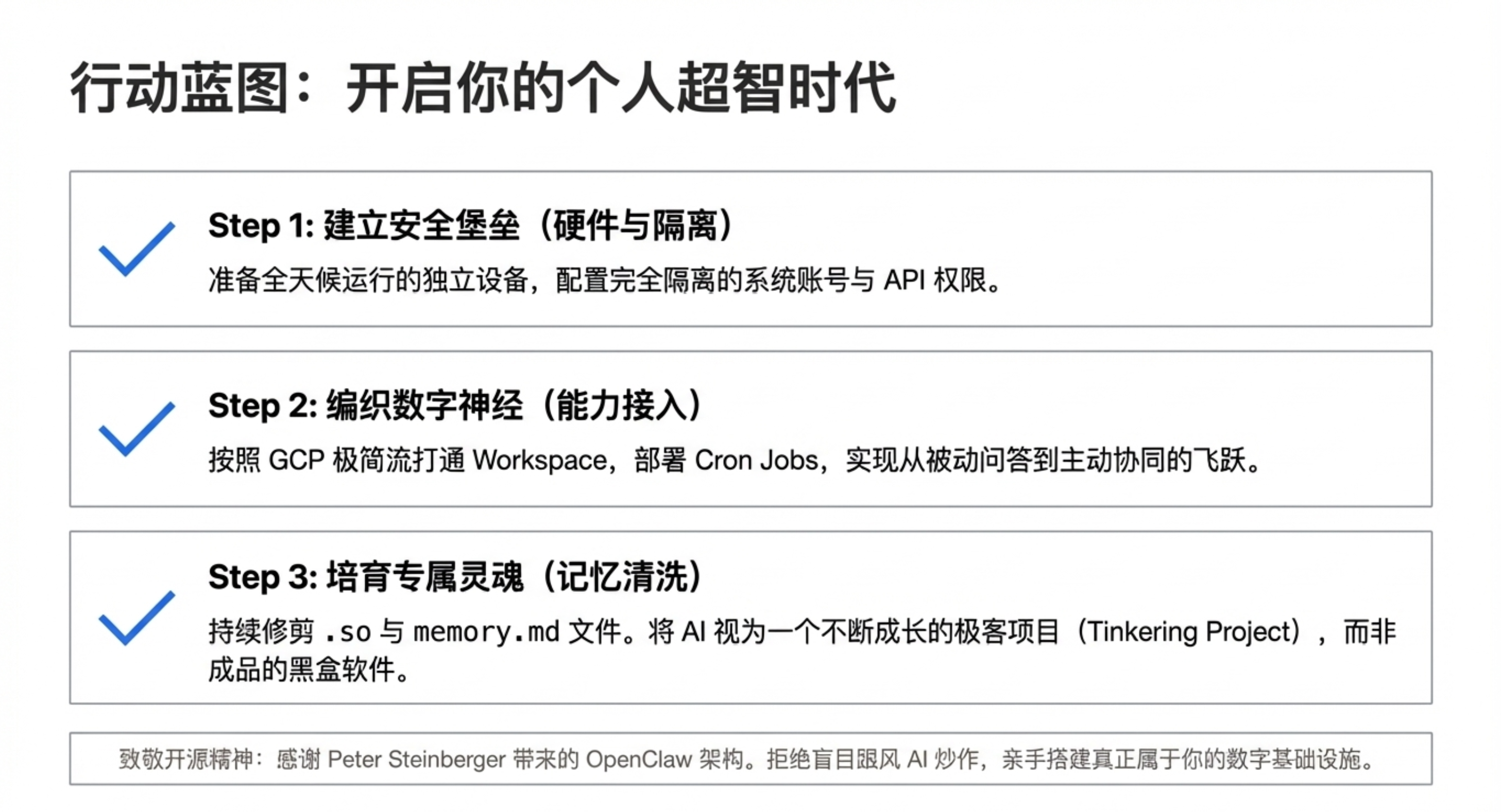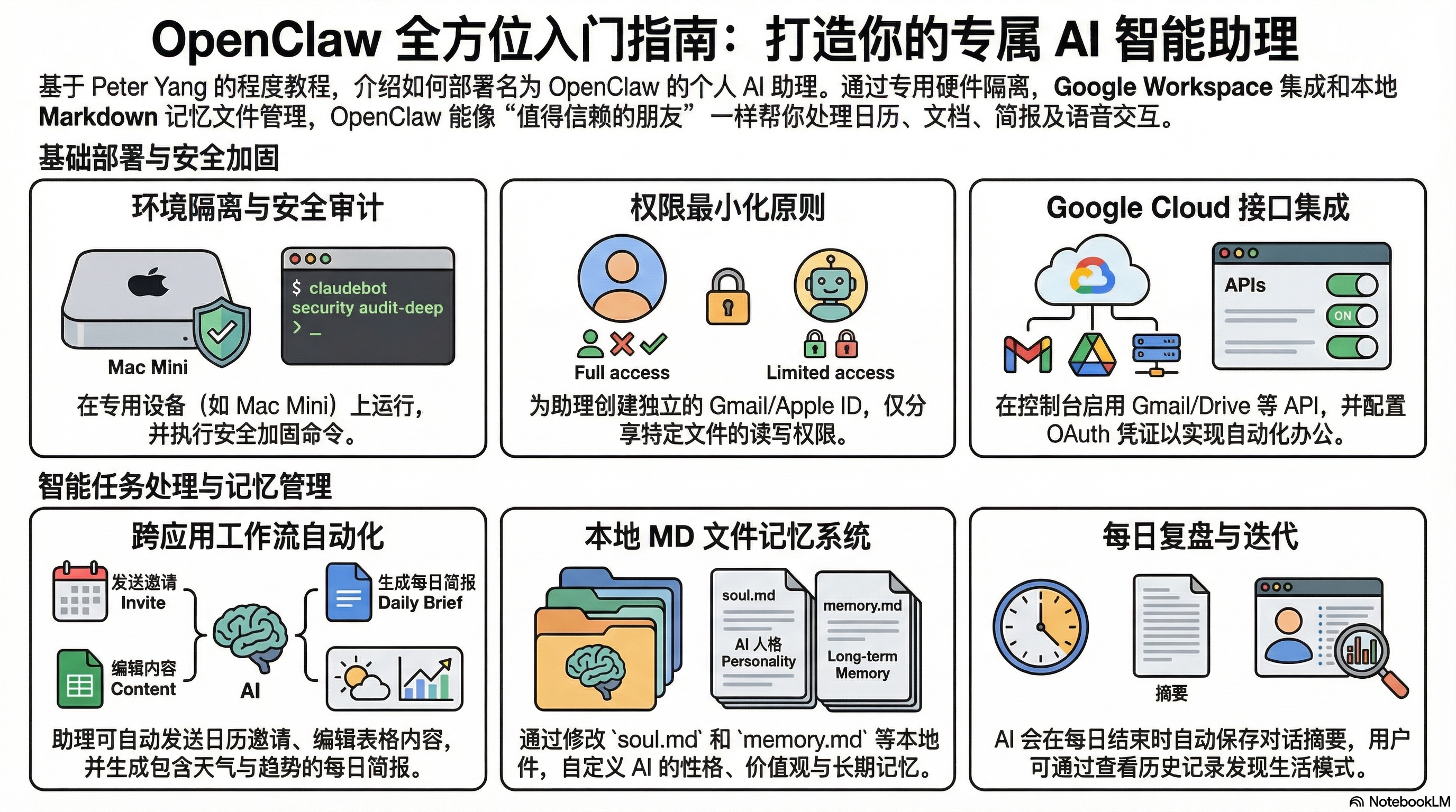 如果 AI 助手能真正记住你的习惯、主动整理日程、甚至帮你回邮件,但前提是——它必须运行在你家一台永远在线的旧电脑上,用独立账号,只被允许访问你指定的几份文档。你愿意吗?本期内容将带你走进开源个人 AI 助手 OpenClaw 的深度配置世界。你会了解到,为何开发者建议用一台 Mac Mini 或旧 MacBook 作为它的“专属牢笼”;如何通过 OAuth 让它安全访问你的 Google 日历和文档,而无需交出主账号密码;更重要的是,你将看到它的“灵魂”如何被几份本地的 Markdown 文件定义——性格、记忆、每日总结,都由你亲手书写或对话调整。从每日简报、语音便条,到每周自动分析 YouTube 数据并给出内容建议,这五个场景或许会颠覆你对“个人助手”的想象。