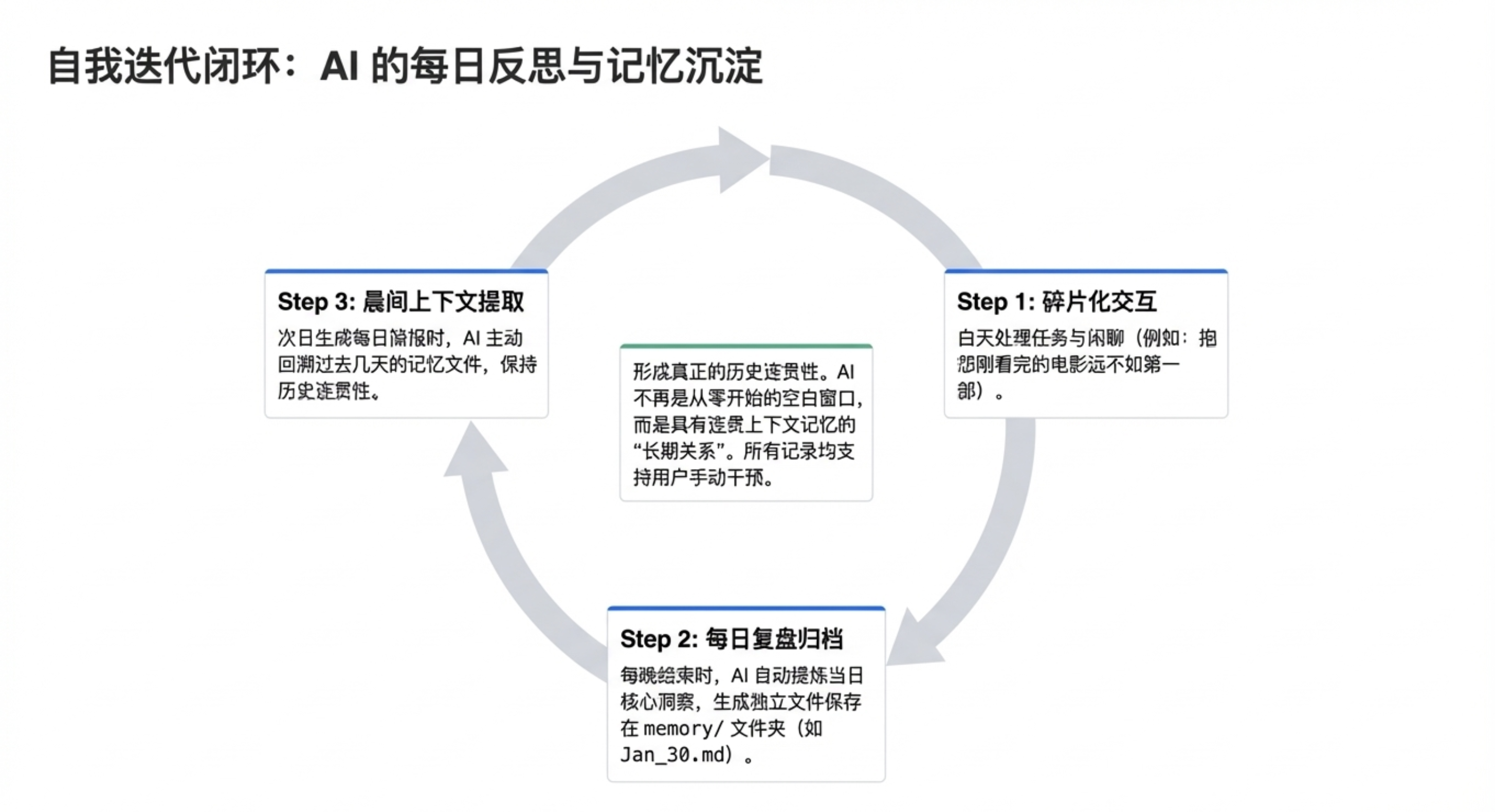 - 动态更新:你可以直接编辑这些 .md 文件,也可以对 Bot 说“记住我喜欢用极简风格”,它会自行写入记忆。