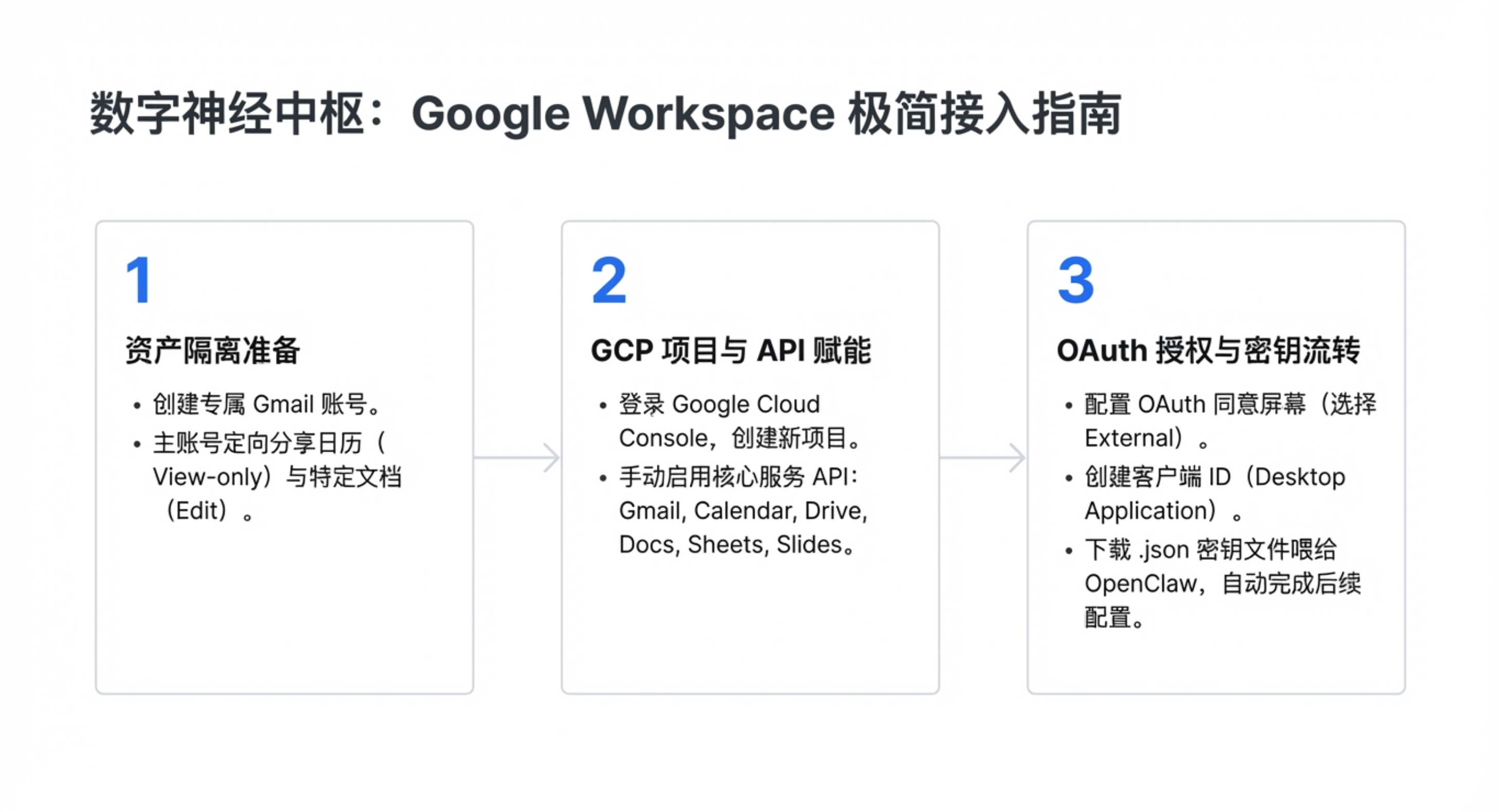 - 创建项目:在 Google Cloud Console 新建项目,手动启用 Gmail、Calendar、Drive 等6个以上 API。