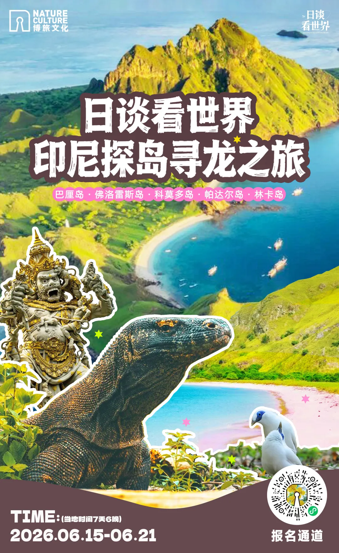 2026年6月15日至21日(端午假期),日谈公园联合博旅文化NatureCulture,发起「日谈看世界」印尼探岛寻龙之旅。博旅文化Nature Culture创始人郑洋老师带队,特邀讲师花蚀老师一路讲解,日谈主播小伙子全程随行。