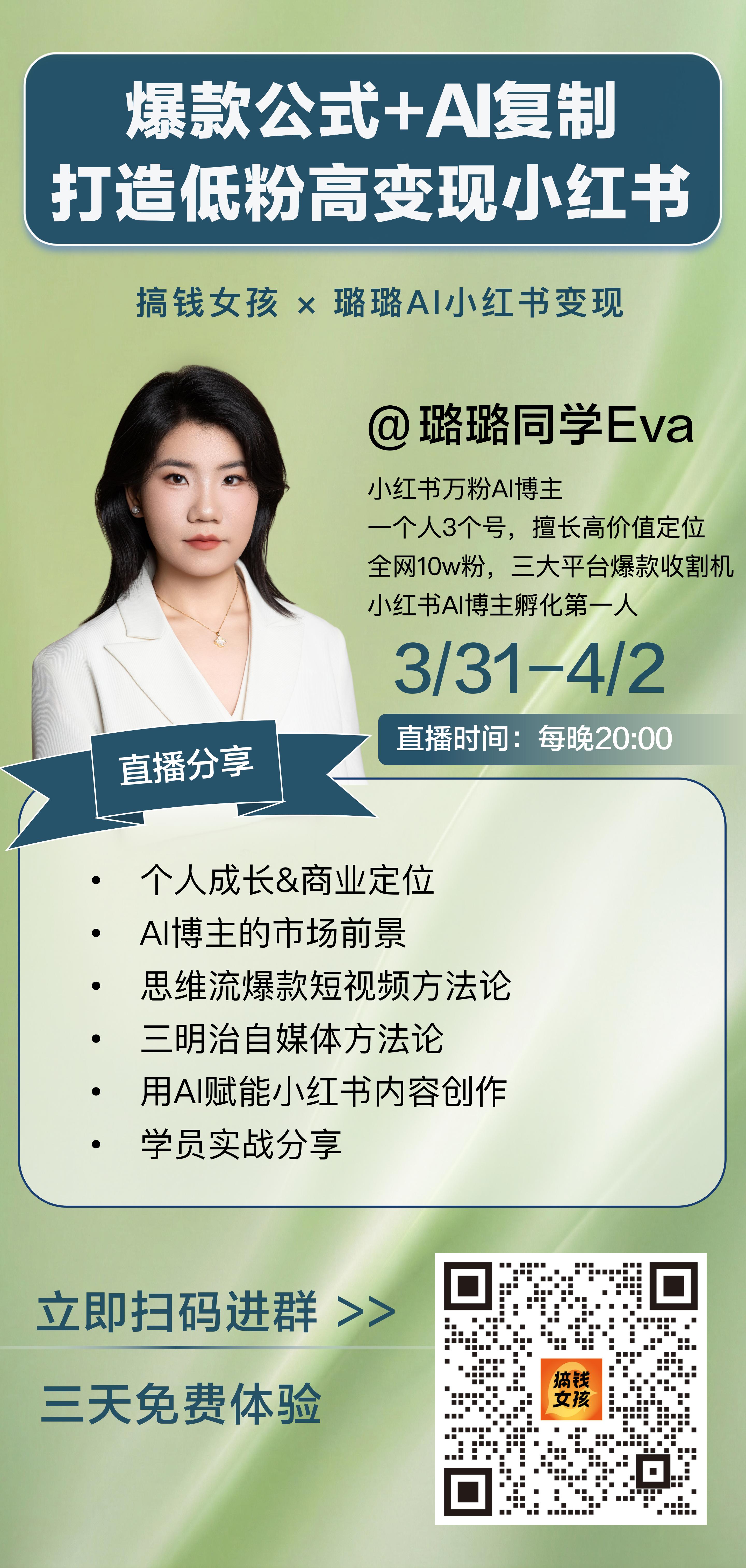 🎁我们邀请璐璐为搞钱女孩听友们专门设计了3天的免费体验营,手把手带你学习她的“思维流”爆款创作方法,欢迎扫描下方二维码或添加官方小助手:gaoqiannvhai2025,3月31日-4月1日,一起转动命运的齿轮!