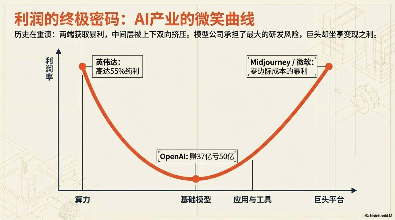 - 解析AI产业的“微笑曲线”:为什么处在中间的基础模型层,被上下两端的算力成本与巨头生态挤压得最惨?