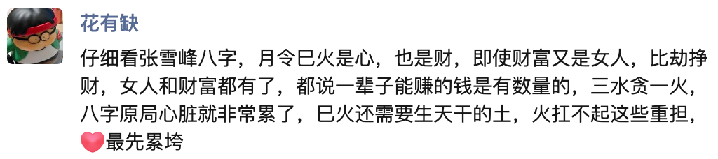 仔细看张雪峰八字,月令巳火是心,也是财,即使财富又是女人,比劫挣财,女人和财富都有了,都说一辈子能赚的钱是有数量的,三水贪一火,八字原局心脏就非常累了,巳火还需要生天干的土,火扛不起这些重担,[爱心]最先累垮