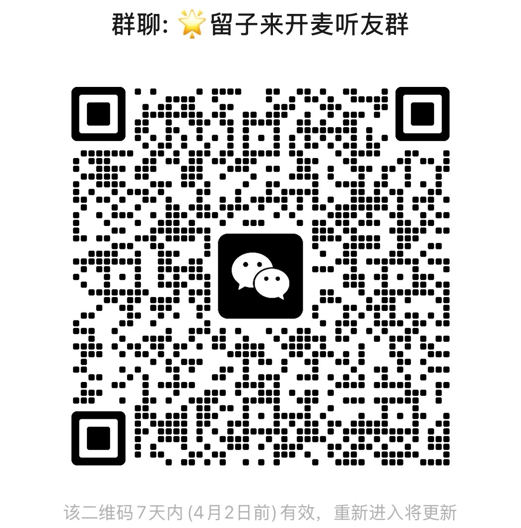 推荐您使用小宇宙app、苹果播客、喜马拉雅、网易云音乐等平台订阅收听《留子来开麦》📱 扫码加入听友群,一起畅聊节目背后的故事!