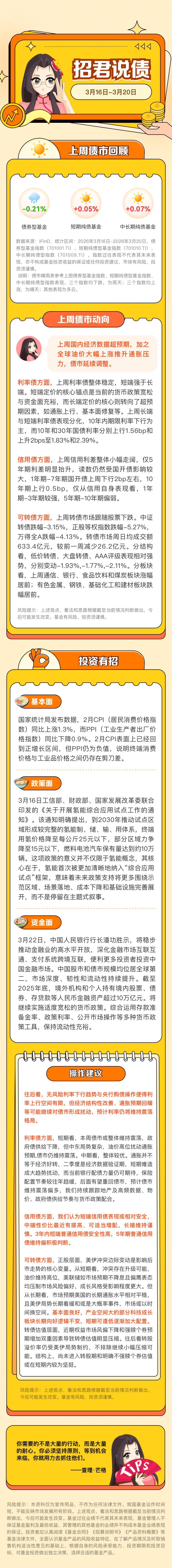 各位听众朋友们大家好,欢迎收听本期的《招君说债》,我是你们的老朋友小招君。今天我们来回顾2026年3月16日至3月20日这一周的债市表现,带您一起梳理市场脉络、解读关键动向,并给出实用的投资建议。