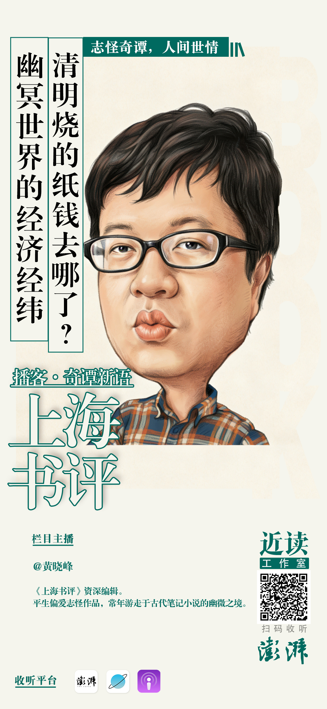 《上海书评》播客全新子栏目《奇谭新语》上线。潜入志怪典籍,打捞人间世情。这档节目由《上海书评》资深编辑、志怪研究人黄晓峰主播,他将带领听众从时事热点出发,返回古籍中的志怪现场,在古今对照中探寻人性与社会的幽微之境。