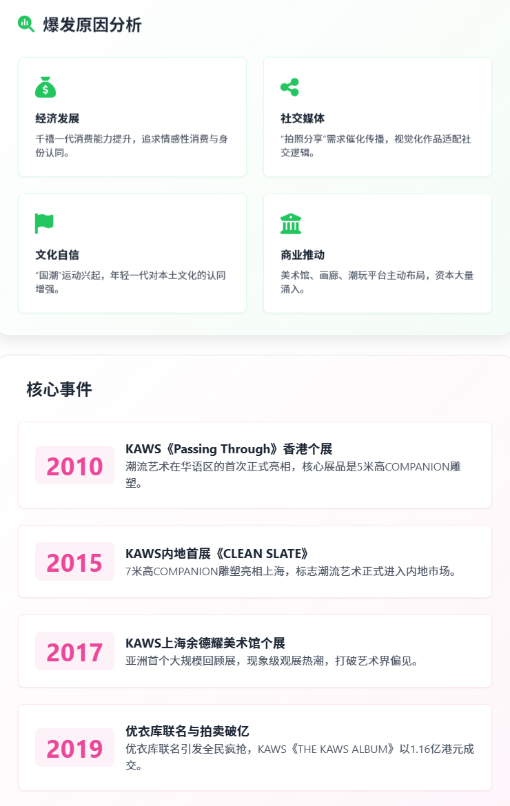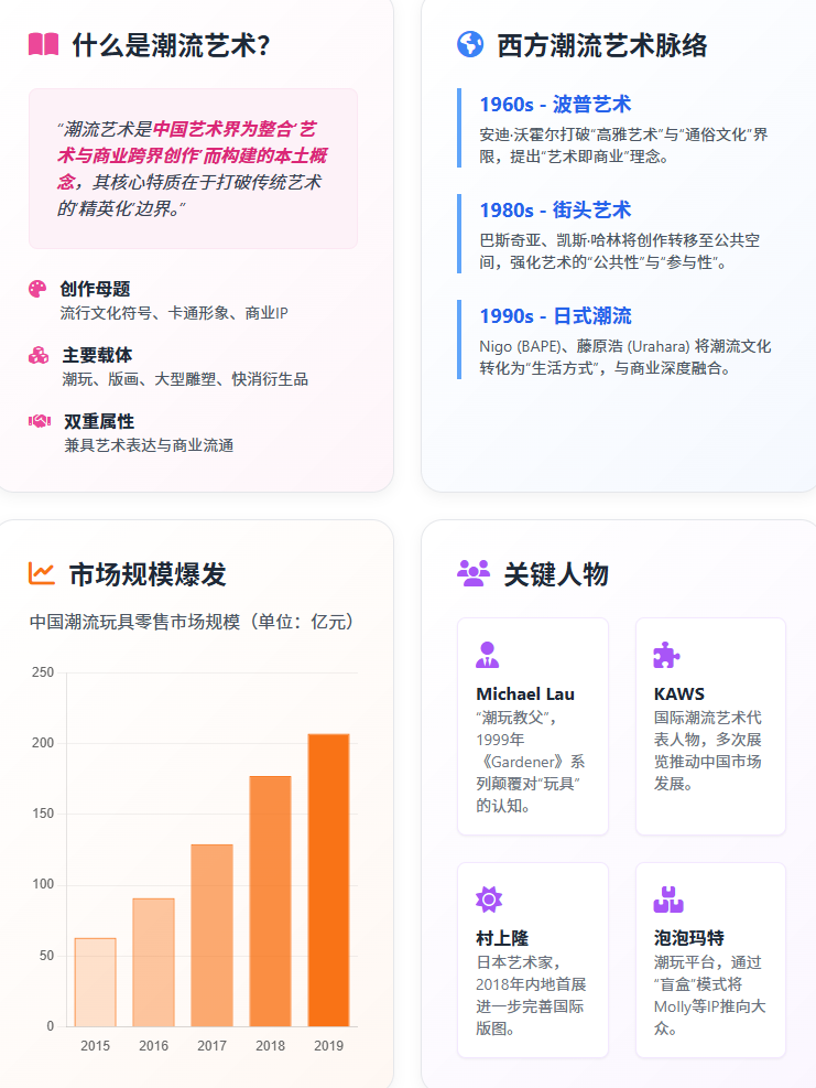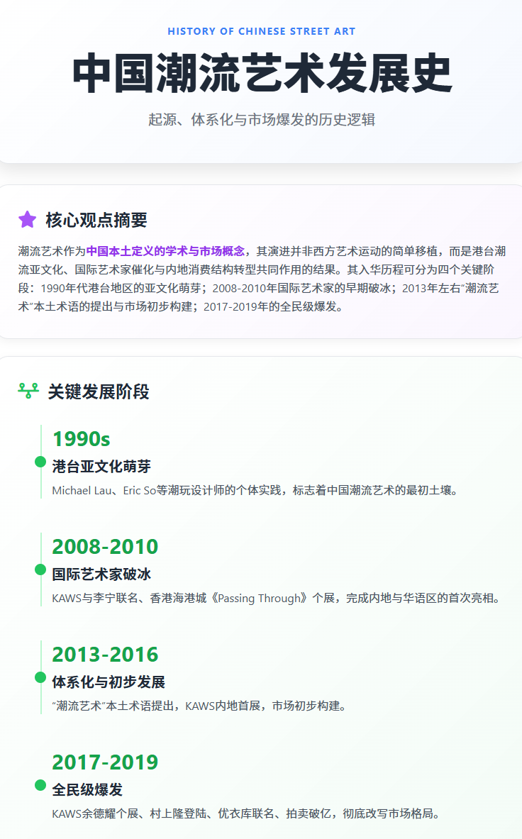 潮流艺术作为中国本土定义的学术与市场概念,其演进并非西方艺术运动的简单移植,而是港台潮流亚文化、国际艺术家催化与内地消费结构转型共同作用的结果。其入华历程可分为四个关键阶段:1990 年代港台地区的亚文化萌芽(以 Michael Lau、Eric So 等潮玩设计师的个体实践为标志);2008-2010 年国际艺术家(如 KAWS)的早期破冰;2013 年左右 “潮流艺术” 本土术语的提出与市场初步构建;2017-2019 年的全民级爆发。推动这一进程的核心动力,是中国年轻一代消费群体的崛起 —— 他们将潮流艺术视为身份认同与文化表达的载体,而商业机构与资本的介入则加速了其从亚文化到主流的范式转移。