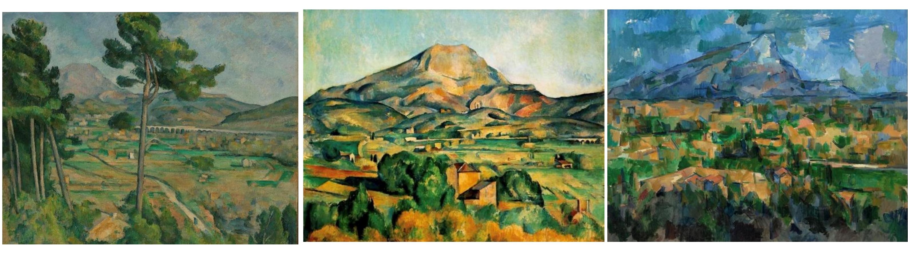 图为:塞尚《圣维克多山》(1882–1885);塞尚《圣维克多山》 (1890–1895);塞尚《圣维克多山》(1902–1906)