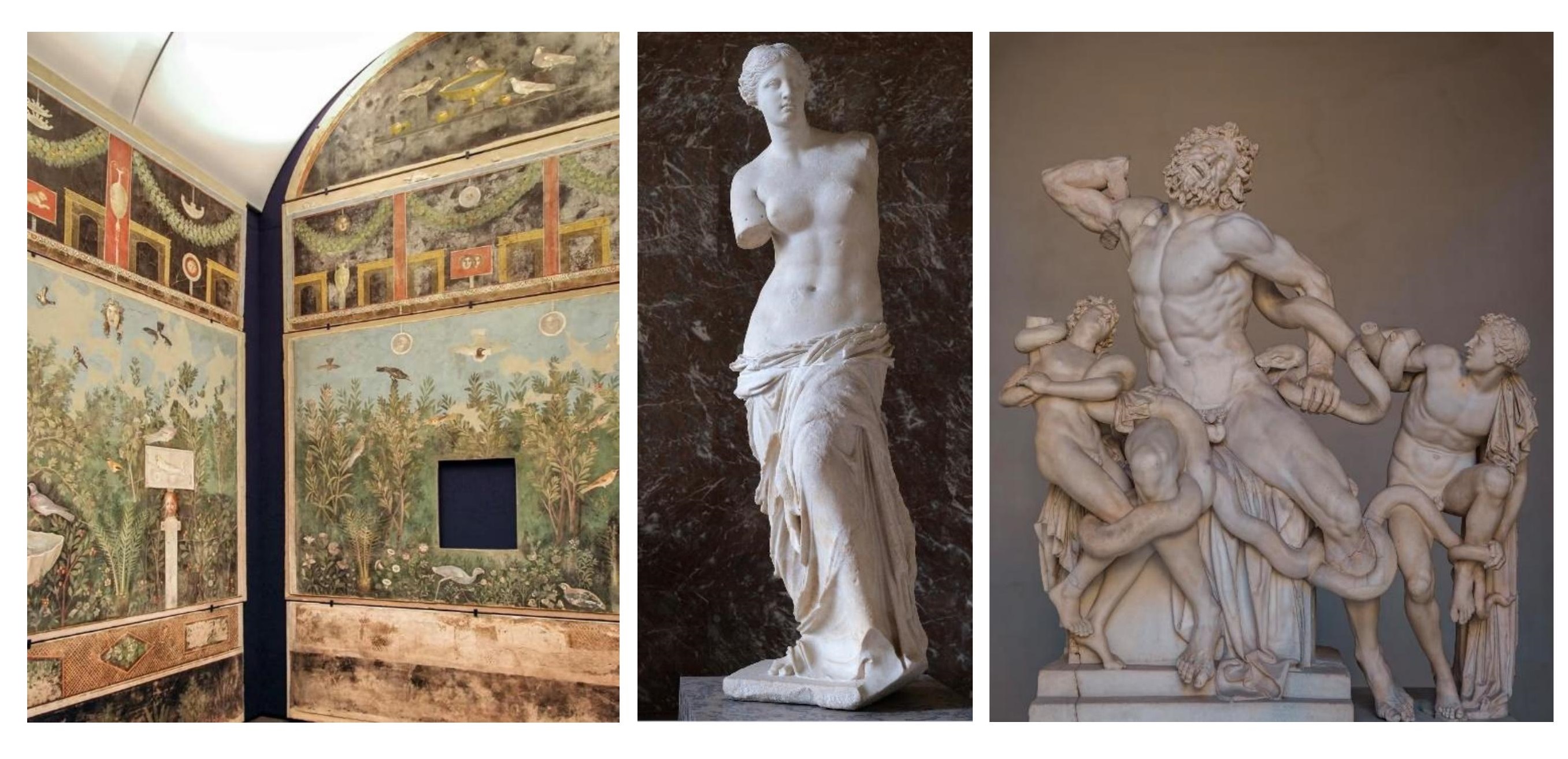图为:庞贝古城“幻景”壁画;《米洛斯的维纳斯》;《拉奥孔》