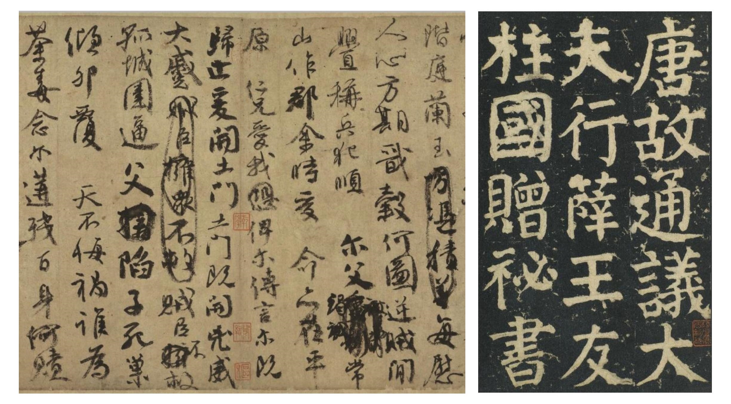 图为:颜真卿《祭侄文稿》;颜真卿《颜家庙碑》