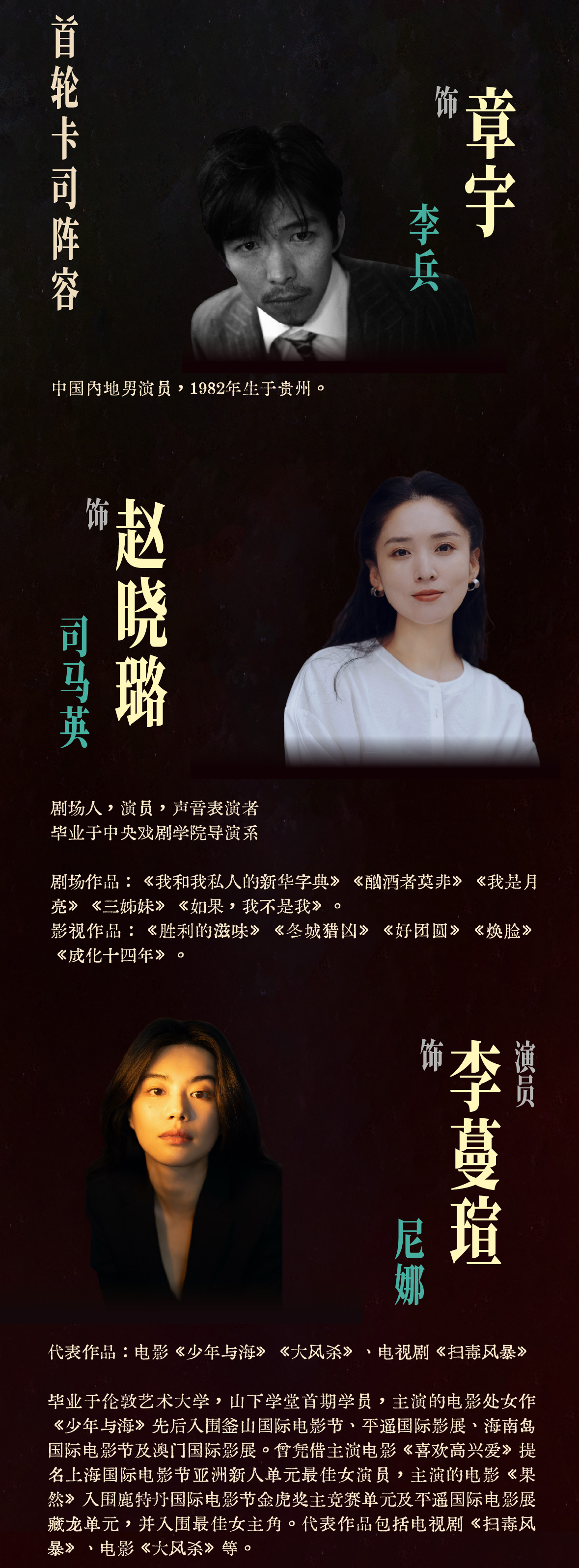 · 章宇:1982年生于贵州,早年就职于贵州省话剧团,中国内地男演员,兼职艺术家,“戏痴”,“轴演员”。话剧《遗爱寺》李兵的扮演者。这次和双雪涛导演的合作也是他阔别话剧舞台多年后的回归。