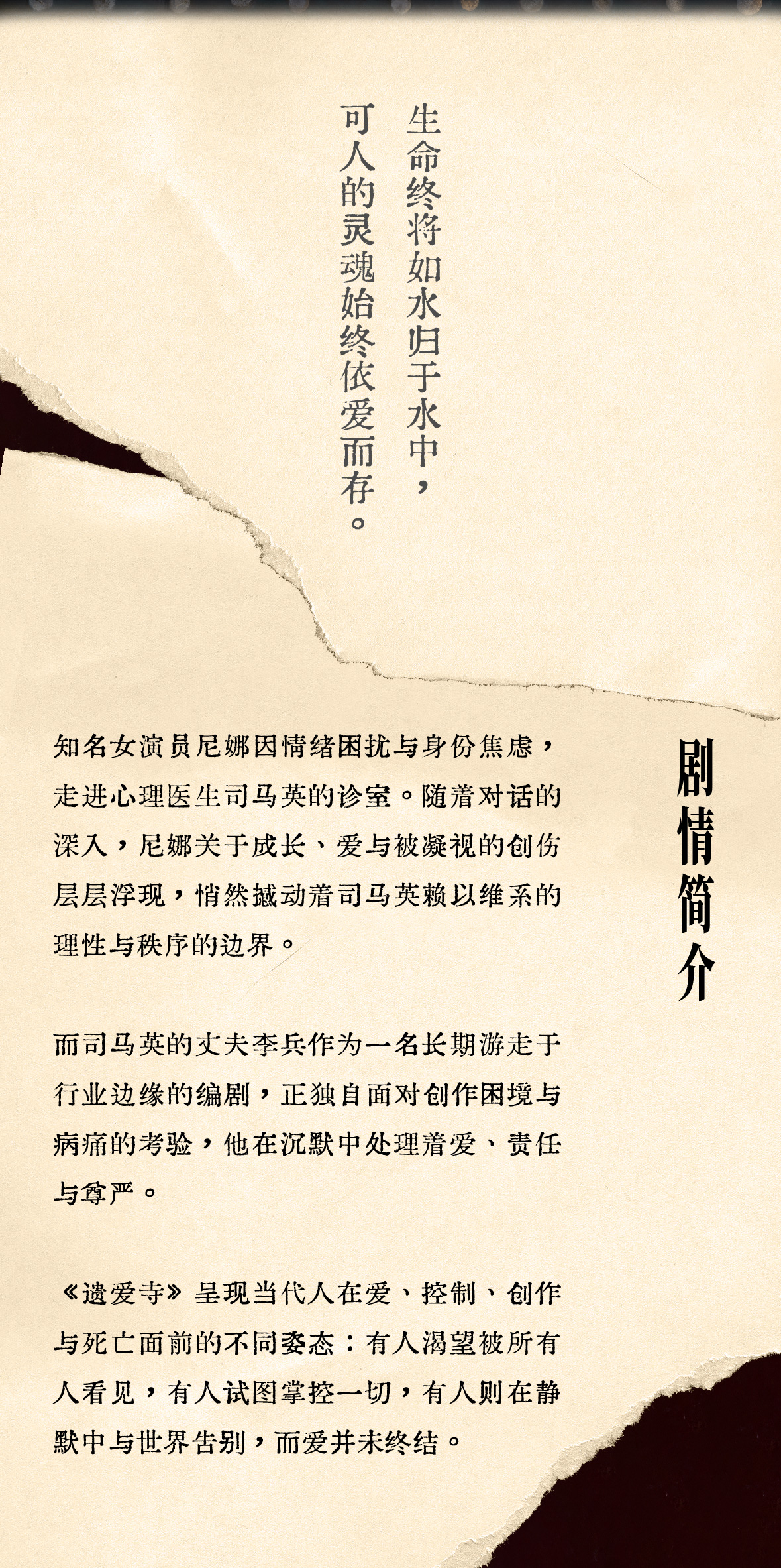 《遗爱寺》的故事始于一次诊室的心理咨询,却最终揭开了三个人的暗伤:试图掌控一切的心理医生、渴望被所有人看见的女演员和在沉默中告别的编剧,导演将他们置于同一时空,职业的理性、公众的凝视、私人的创痛在此交织,边界不断坍塌…...